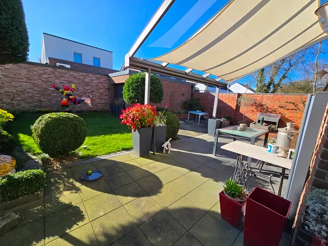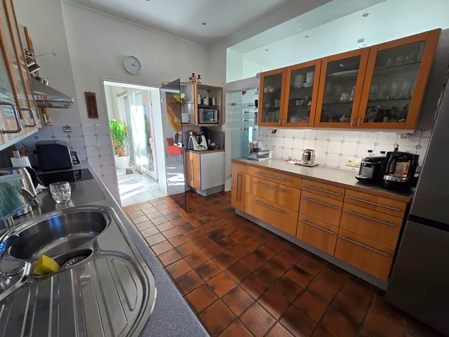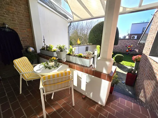 Erdgeschoss ca. 115m² Wohnfläche und 1 Garage. 4 Zimmer, große Küche, Bad mit Wanne und Bidet, vor ca.7 Jahren bodentiefe neue Dusche im Bad. Loggia und sehr große überdachte Terrasse und Garten. Holzdielen und PVC- Belag, Schlafzimmer mit Ankleide. Etwa 2/3 der Wohnfläche Fußbodenheizung. Gaszentralheizung. Eigener Kellerzugang auch von der Terrasse.