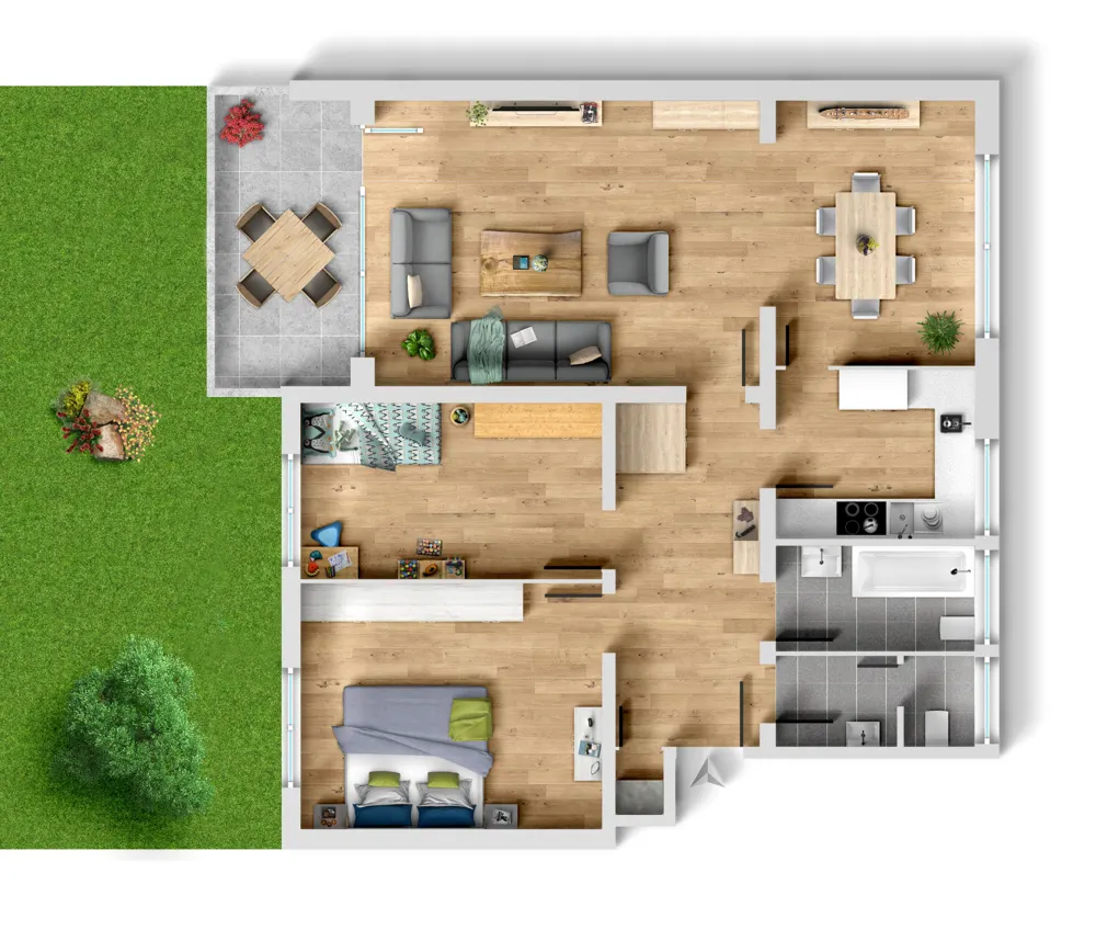 Viel Platz zum Leben und Quality-Time bietet diese 3,5-4 Zimmerwohnung mit einem schönen Süd-West-Balkon und den Blick „“ins Grüne“. Hier haben Sie die Möglichkeit eine Treppe vom Balkon in Ihren Ziergarten führen zu lassen. Dieser beinhaltet die gesamte Wohnungsbreite und 4 m in der Tiefe.
