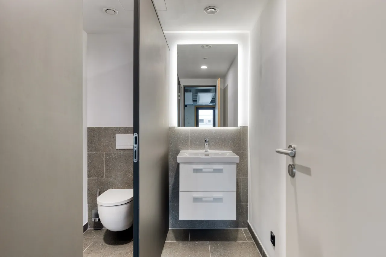 Moderne und getrennte Sanitäranlagen sowie barrierefreie WCs auf jeder Etage unterstreichen den hohen Komfortstandard des Gebäudes. Die barrierefreie Erschließung aller Ebenen macht Et Bröckske zudem zu einem zukunftsfähigen Standort, der auch Besucherinnen und Besuchern mit Mobilitätseinschränkungen einen komfortablen Zugang ermöglicht.