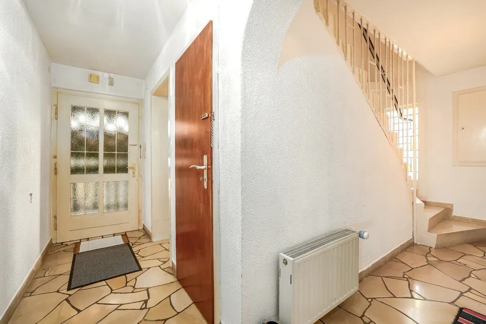 Über ein paar Stufen gelangen Sie zur Eingangstür, die durch das schützende Vordach bei jedem Wetter einen trockenen Zugang zum Haus bietet. Die Überdachung verleiht dem Eingangsbereich zusätzlich einen einladenden Charakter und bietet auch Raum für dekorative Elemente, um Gäste stilvoll zu empfangen.