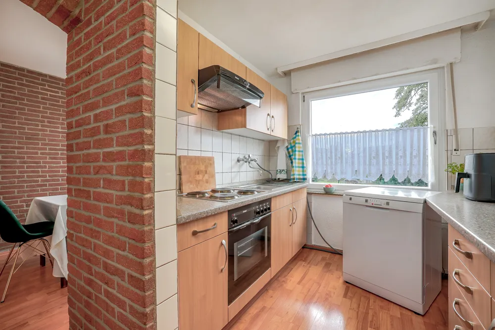 Im Erdgeschoss erwartet Sie eine offene und gemütliche Raumaufteilung. Die Küche ist durch einen rustikalen Türbogen aus Backsteinen vom angrenzenden Esszimmer getrennt ist. Der charmante Backstein-Stil setzt sich an einer Wand des Esszimmers fort und verleiht dem Raum eine warme und behagliche Atmosphäre. Vom Esszimmer aus gelangen Sie durch einen weiteren offenen Bogen in das helle, großzügige Wohnzimmer. Hier haben Sie Zugang zu einem Balkon, der einen schönen Blick auf den Garten bietet und viel Tageslicht hereinlässt. Zusätzlich gibt es auf dieser Ebene ein weiß gefliestes Badezimmer sowie ein weiteres Zimmer, das flexibel als Schlafzimmer, Arbeitszimmer oder Gästezimmer genutzt werden kann.