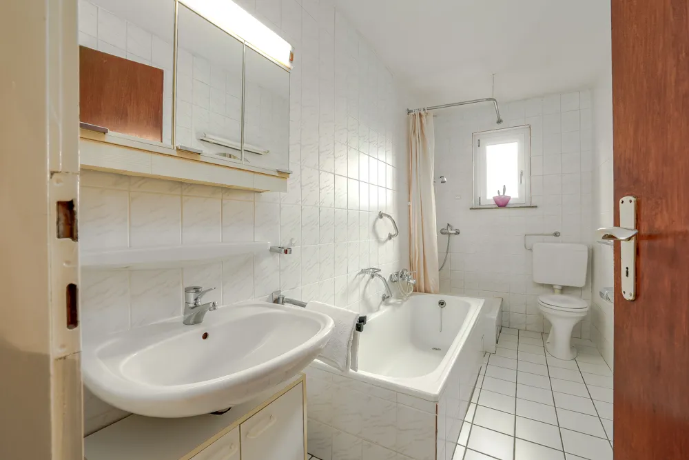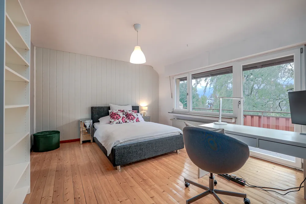 Im Obergeschoss befindet sich ein großes Schlafzimmer mit direktem Zugang zu einem weiteren Balkon. Ein kleineres Zimmer, derzeit als Küche genutzt, kann flexibel umgestaltet werden. Zwei weitere Zimmer sowie ein vollwertiges Badezimmer komplettieren diese Ebene.