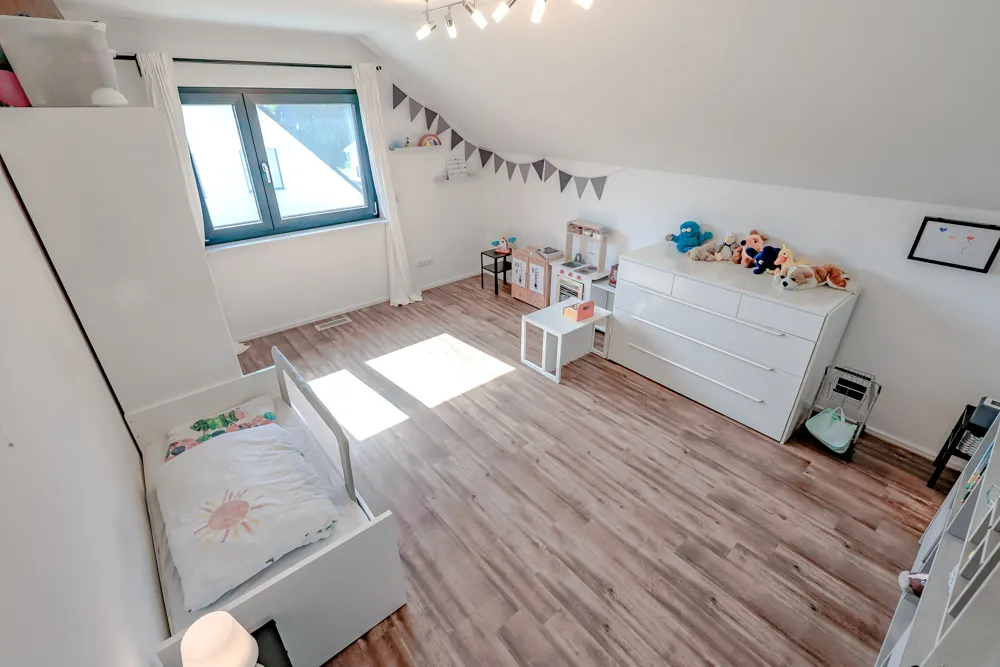 + Hoher Kniestock im Obergeschoss – kaum Einschränkungen durch Dachschrägen