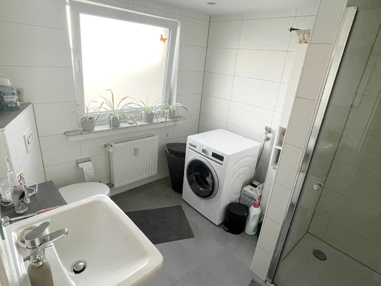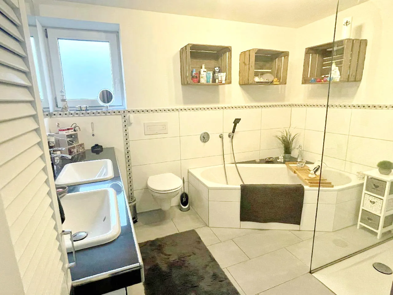Wohnzimmer, offene Küche mit Essplatz, 3 Schlafzimmer, schönes Badezimmer mit Eckbadewanne, Gäste-Toilette, Terrasse und Garten zur alleinigen Nutzung