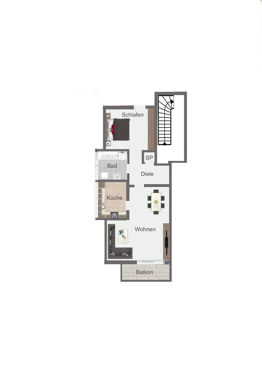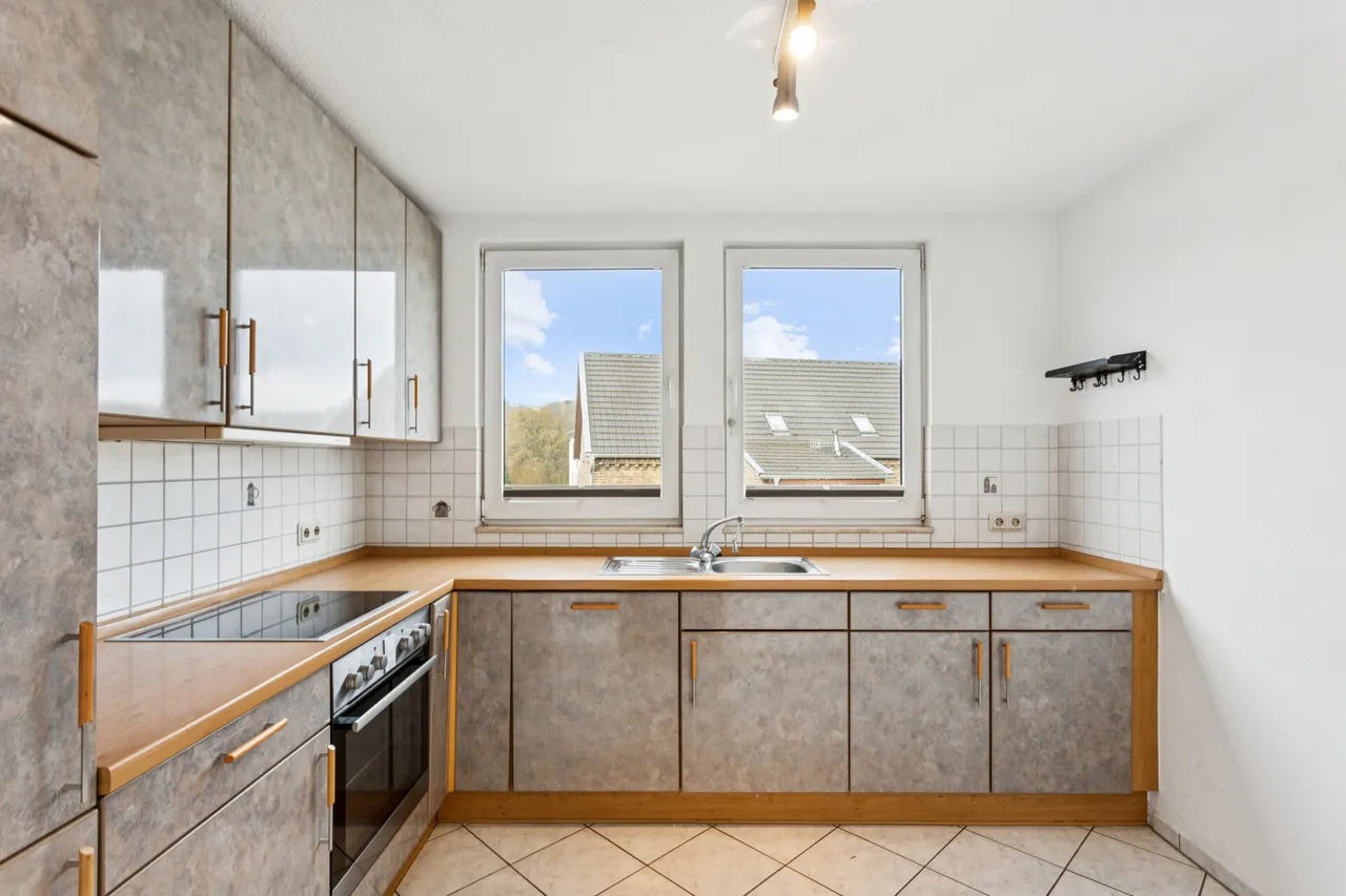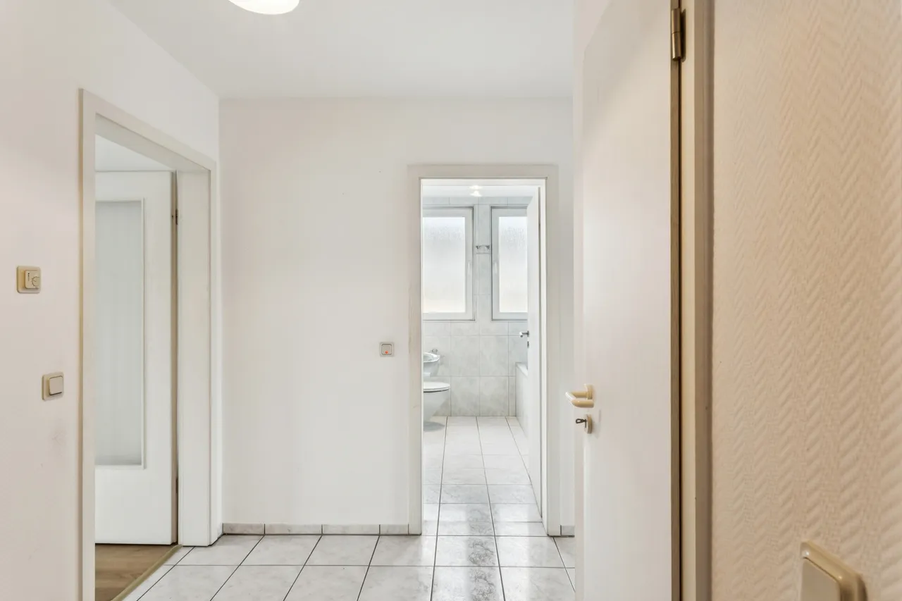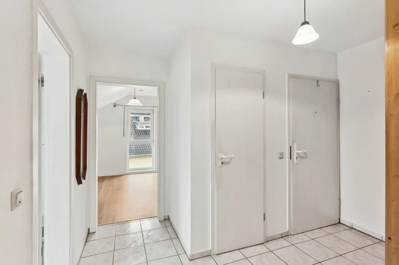 Diese gepflegte 2-Zimmer-Wohnung befindet sich in einem ruhigen 6-Parteienhaus in Lohmar-Wahlscheid und bietet auf rund 58 m² Wohnfläche eine attraktive Kombination aus Komfort und Funktionalität. Die Wohnung überzeugt durch eine durchdachte Raumaufteilung und eine helle, freundliche Atmosphäre. Das gemütliche Wohnzimmer mit Zugang zum schönen Balkon inklusive Markise lädt zum Entspannen ein. Das Tageslichtbad ist mit Dusche und Badewanne ausgestattet und bietet zusätzlichen Komfort. Alle Räume, bis auf die Gauben in Küche und Badezimmer, verfügen über Rollläden, was für Privatsphäre und angenehme Lichtverhältnisse sorgt. In Flur, Küche und Bad sind pflegeleichte Fliesen verlegt, während Wohn- und Schlafzimmer mit einem modernen Vinylboden in Holzoptik ausgestattet sind.