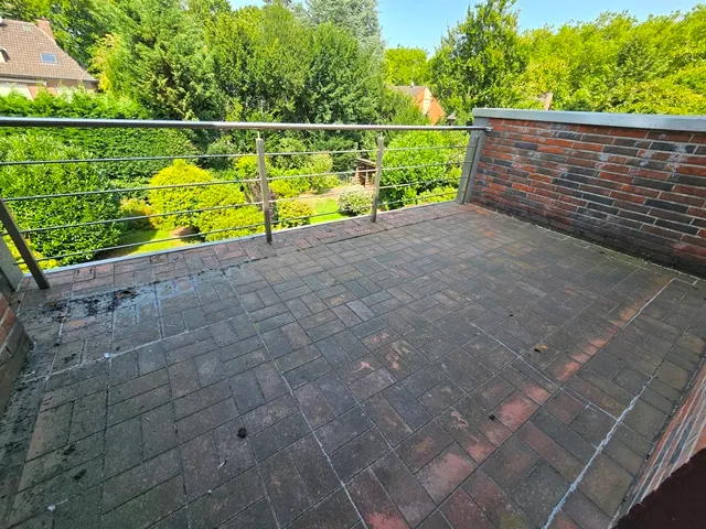 Im 1. OG 3 Zimmer, davon ein schönes Erkerzimmer, und ein sehr großzügiges Bad mit Wanne, Dusche und Bidet. Auf dem Balkon/Terrasse am Schlafzimmer lässt sich u.a. der Abend ausklingen.
