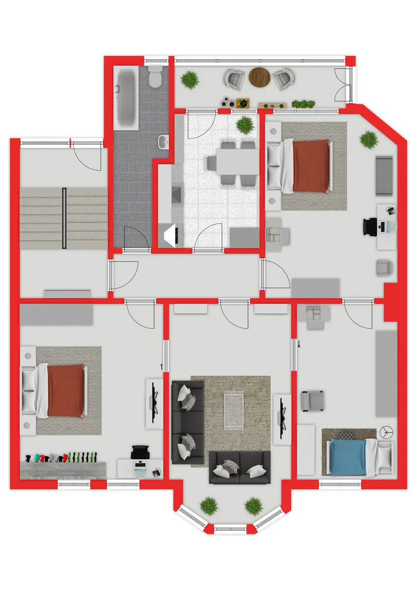 In den oberen Stockwerken befinden sich großzügig geschnittene 4-Zimmerwohnungen, die sich über das 1. bis zum 3. Obergeschoss erstrecken. Jede Wohnung ist mit einem Tageslichtbad ausgestattet, was für zusätzlichen Komfort sorgt. Highlight sind die Wintergärten im 1. und 2. Obergeschoss, die ein besonderes Wohnerlebnis bieten.