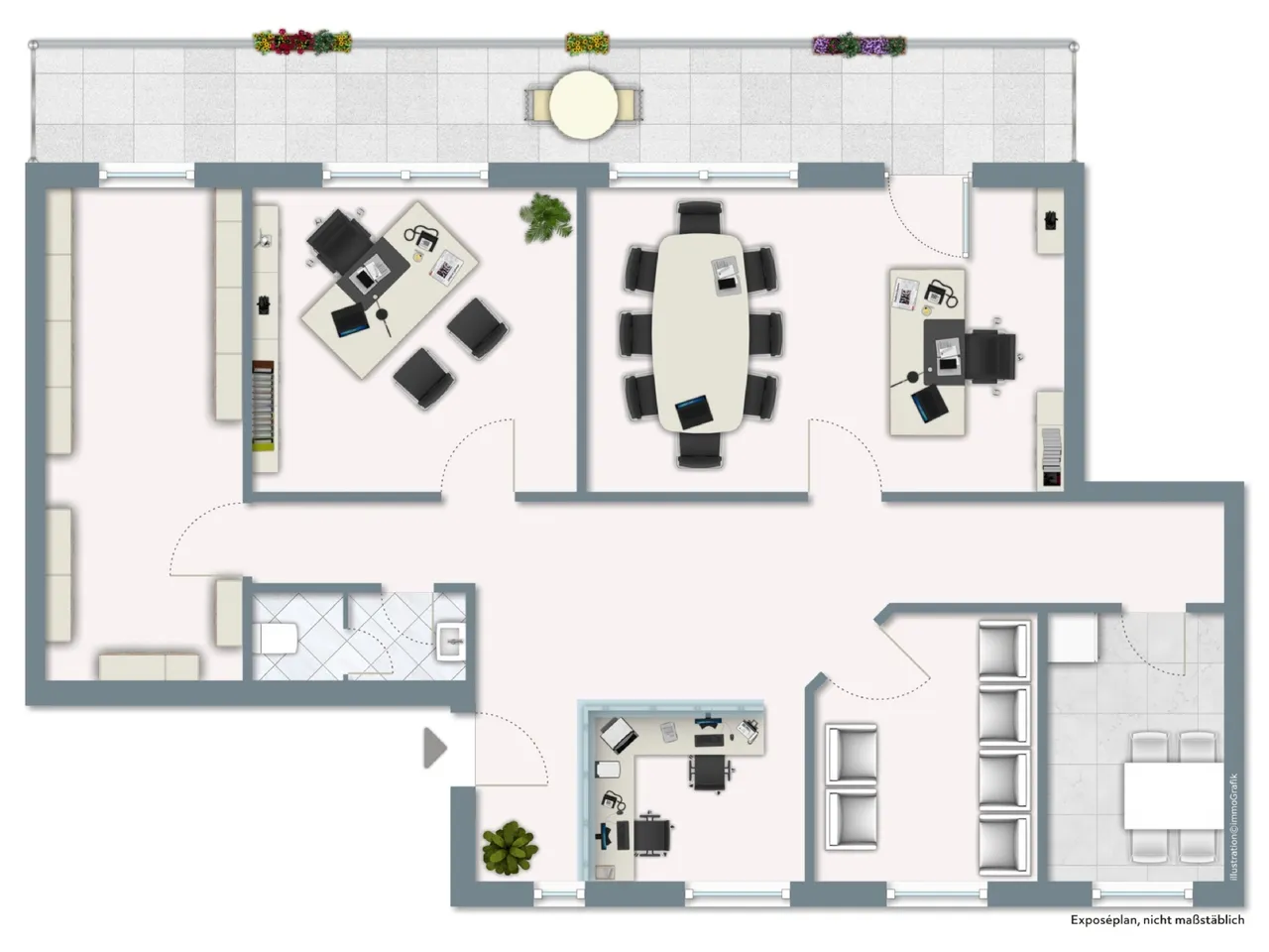 Die Büroeinheit verfügt über drei lichtdurchflutete Büroräume, die Ihnen eine angenehme Arbeitsatmosphäre garantieren. Ein einladender Empfangsbereich mit separatem Wartezimmer heißt Ihre Kunden herzlich willkommen. Die Küche lädt zu Pausen und informellen Meetings ein, während ein Badezimmer mit WC und Waschbecken den Komfort für Mitarbeiter und Besucher erhöht.