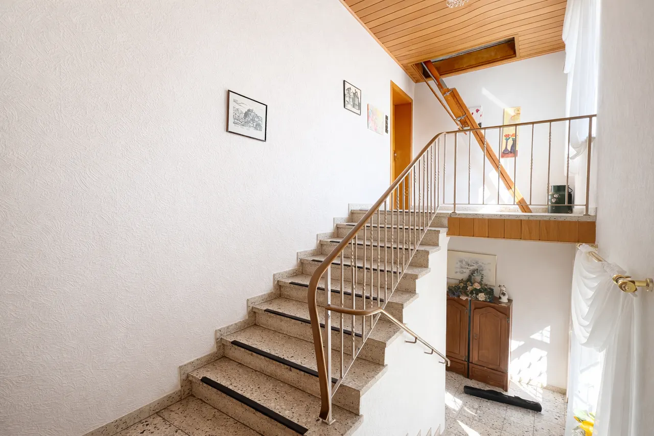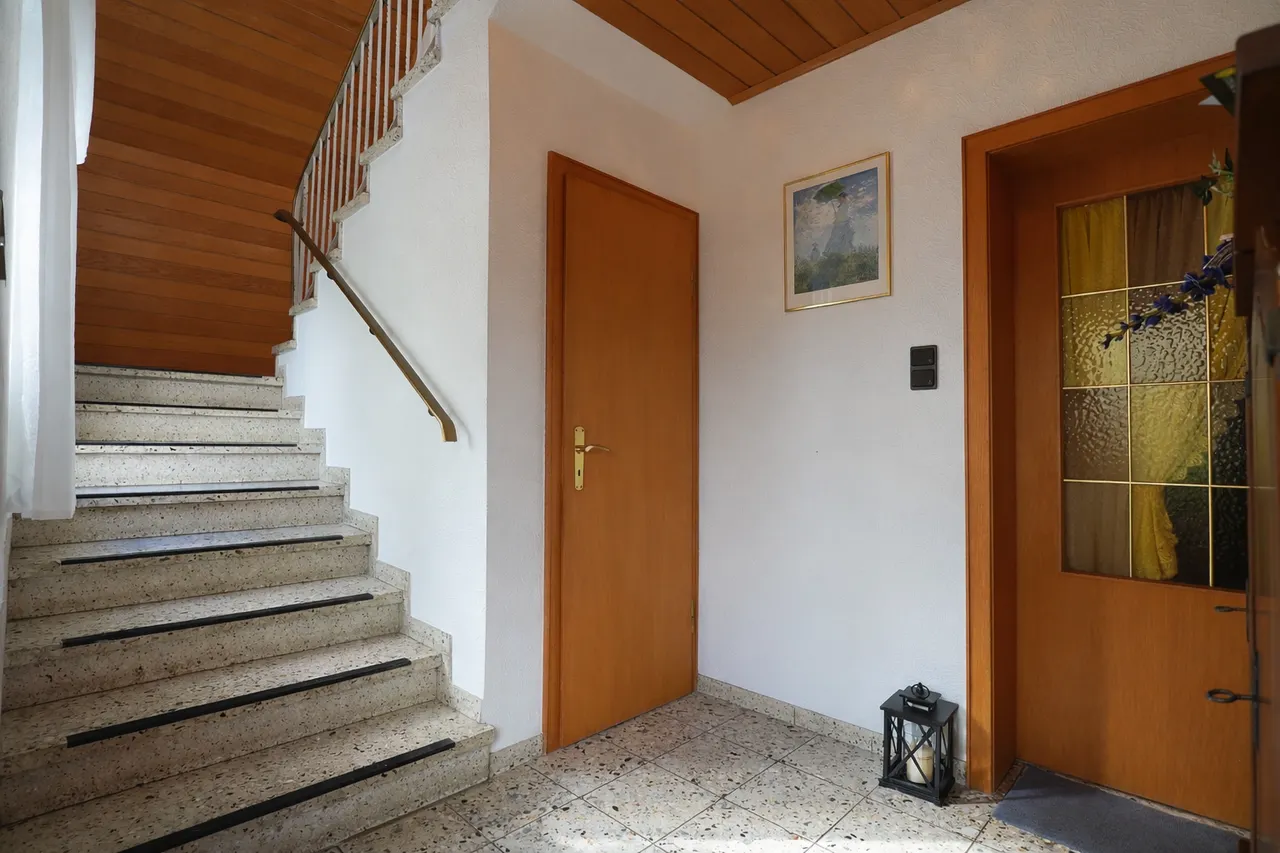 Über das zentrale Treppenhaus sind der Keller sowie beide Wohneinheiten erreichbar.