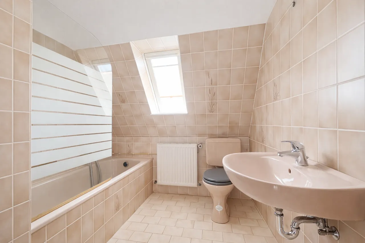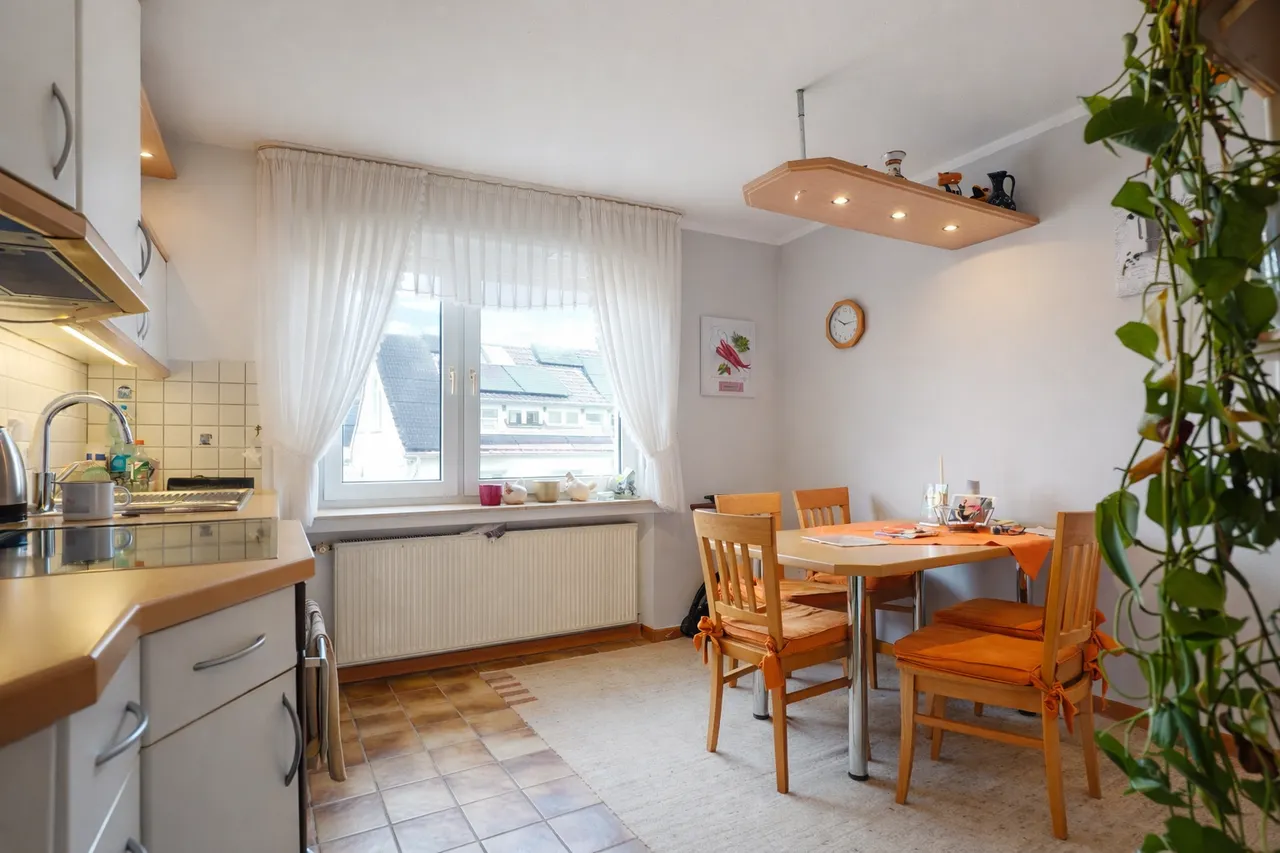 Die ca. 67 m² große Dachgeschosswohnung ist als klassische 3-Zimmerwohnung ausgebaut. Über die zentrale Diele sind hier ebenfalls alle Zimmer erschlossen. Auf der rechten Seite liegen die Küche sowie das Tageslichtbad mit Badewanne. Im weiteren Verlauf befinden sich ein Schlafzimmer sowie auf der linken Dielenseite ein geräumiges Wohnzimmer sowie ein weiteres Schlafzimmer.