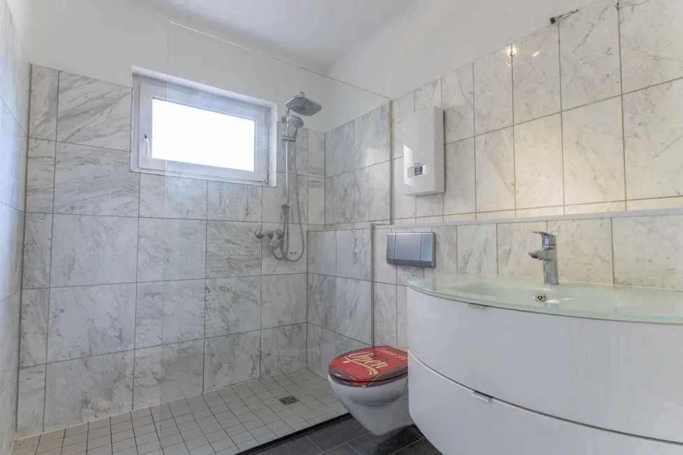 Für ein stilvolles Wohnambiente sorgt der durchgehend verlegte, hellgrau marmorierte Marmorboden, der Kombination mit der Fußbodenheizung zudem für eine moderne Wohnqualität sorgt. Durch die großen Fensterflächen gelangt viel Tageslicht in die Räume, wodurch eine freundliche und offene Wohnatmosphäre entsteht.