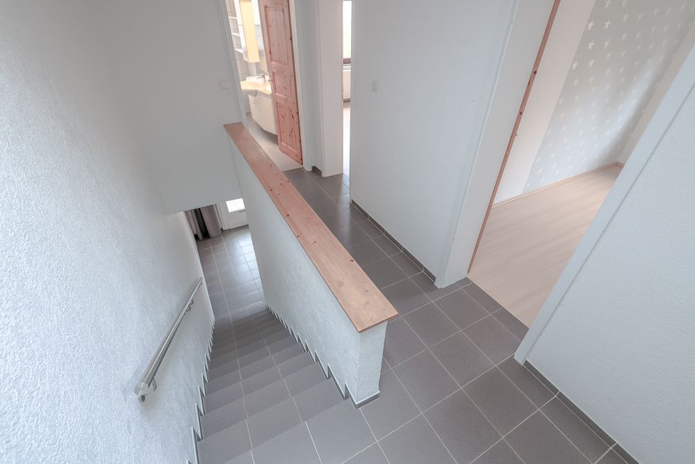 Im Obergeschoss befinden sich ein zentraler Flur, zwei Schlafzimmer sowie ein Badezimmer. Das Bad ist mit einer Eckbadewanne, einer Eckdusche, einem Waschbecken, einem WC, einem Handtuchheizkörper sowie einem Fenster ausgestattet. Im Flur sorgt eine Lichtkuppel in der Decke, die Tageslicht von oben einfallen lässt, für eine freundliche und helle Atmosphäre.