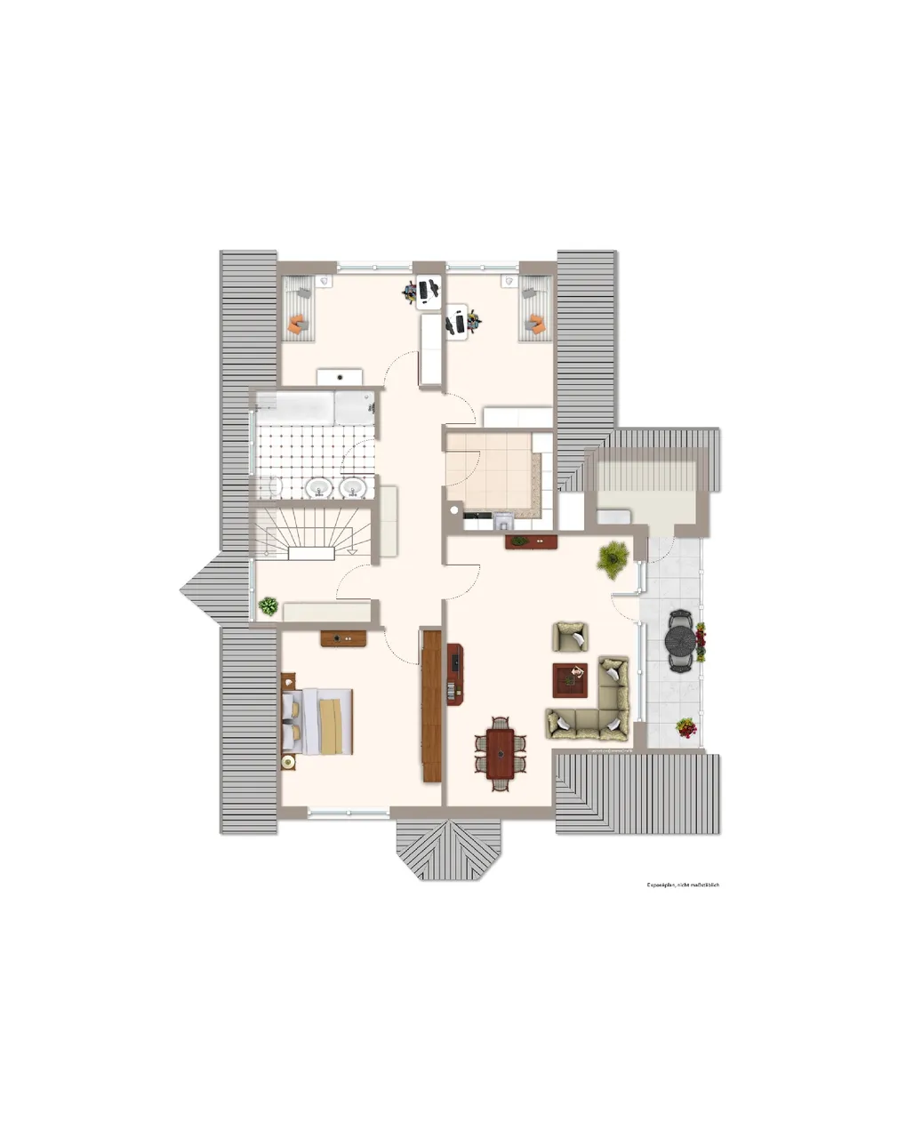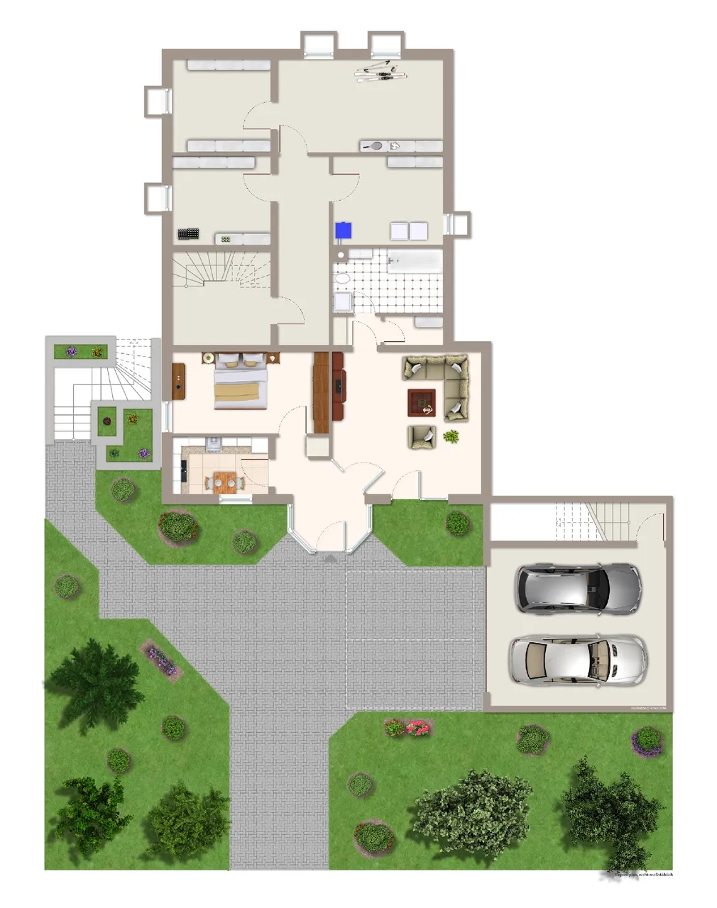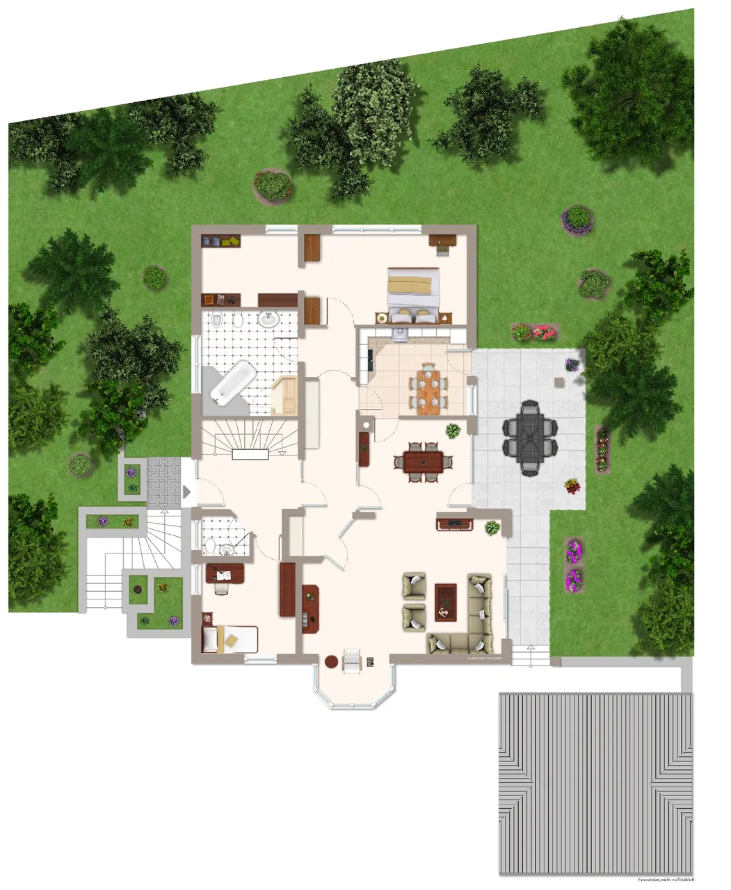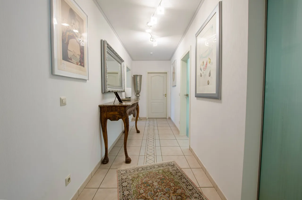 Das Erdgeschoss umfasst ca.137 m² verfügt über 2 geräumige Zimmer, Küche, Diele und Bad. Das gut geschnittene Wohnzimmer mit dem angrenzenden Essbereich, ist ideal für gesellige Abende. Von hier haben Sie Zugang auf die sonnige Terrasse und den Garten. Ein Ruhebereich zum Entspannen und verweilen.