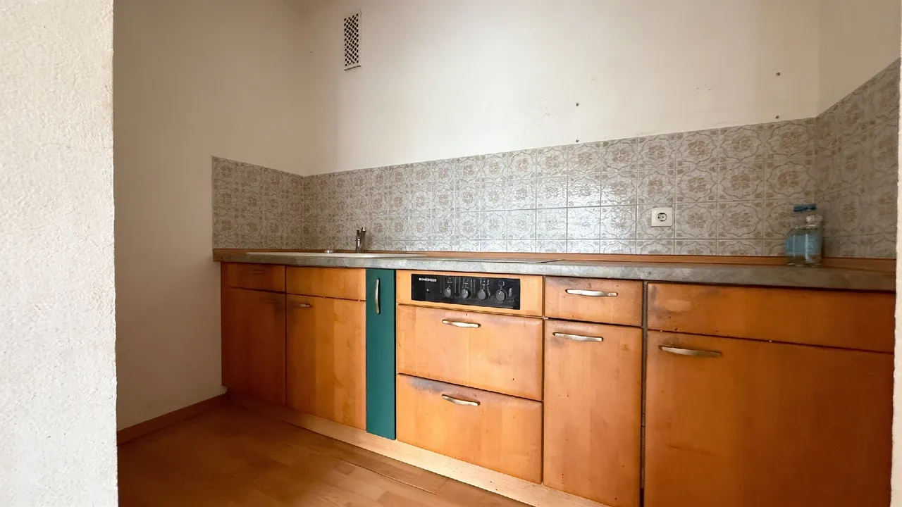 Die separate Kochnische ist praktisch integriert und ermöglicht eine Verbindung zwischen Wohnen und Kochen.