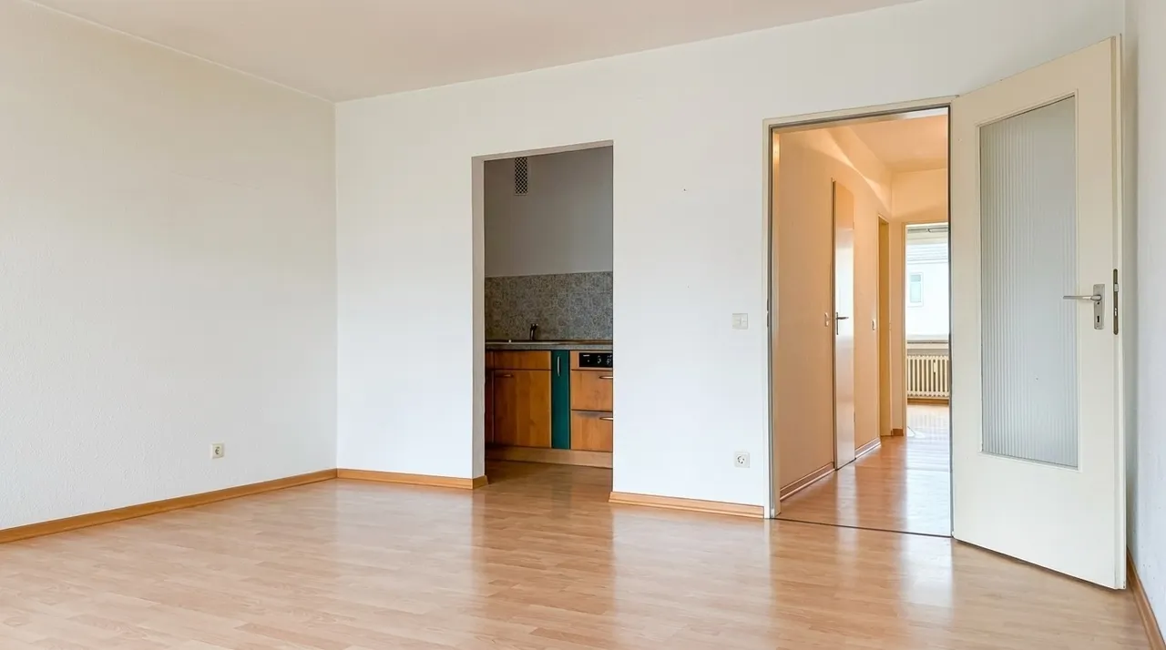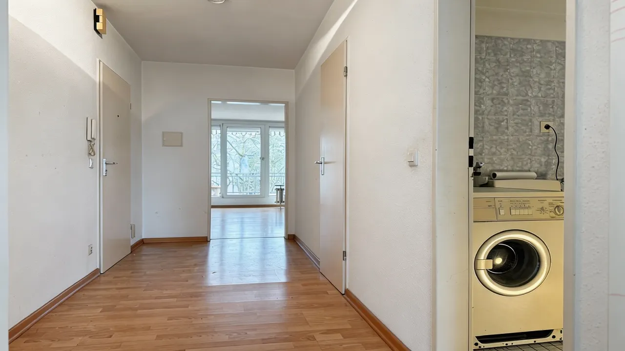 Schon beim Eintreten empfängt Sie eine zentrale Diele, von der aus alle Räume gut erreichbar sind. Der Wohnbereich wirkt freundlich und einladend und bietet ausreichend Platz für eine gemütliche Sofaecke sowie einen kleinen Essbereich. Von hier aus gelangen Sie auf den von der Straße abgewandten Balkon mit Blick ins Grüne. Ein schöner Rückzugsort für den ersten Kaffee am Morgen oder einen entspannten Feierabend mit angenehmer Ruhe.