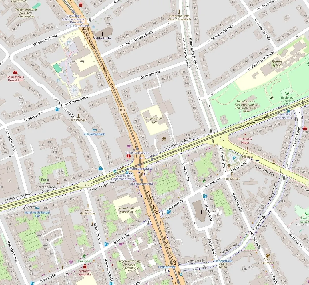 Einkaufsmöglichkeiten befinden sich entlang der nahegelegenen Ackerstraße und rund um den Hermannplatz siwe auf der Benderstraße. Neben Supermärkten, Bäckereien, Apotheken und Drogerien finden sich hier kleine Boutiquen, Cafés und individuelle Gastronomiekonzepte. Das Capitol Theater Düsseldorf sowie zahlreiche Galerien und Ateliers unterstreichen den kulturellen Charakter des Viertels. Für Erholung im Grünen bietet der Zoopark Düsseldorf mit seinen weitläufigen Grünflächen eine attraktive Naherholungsmöglichkeit.