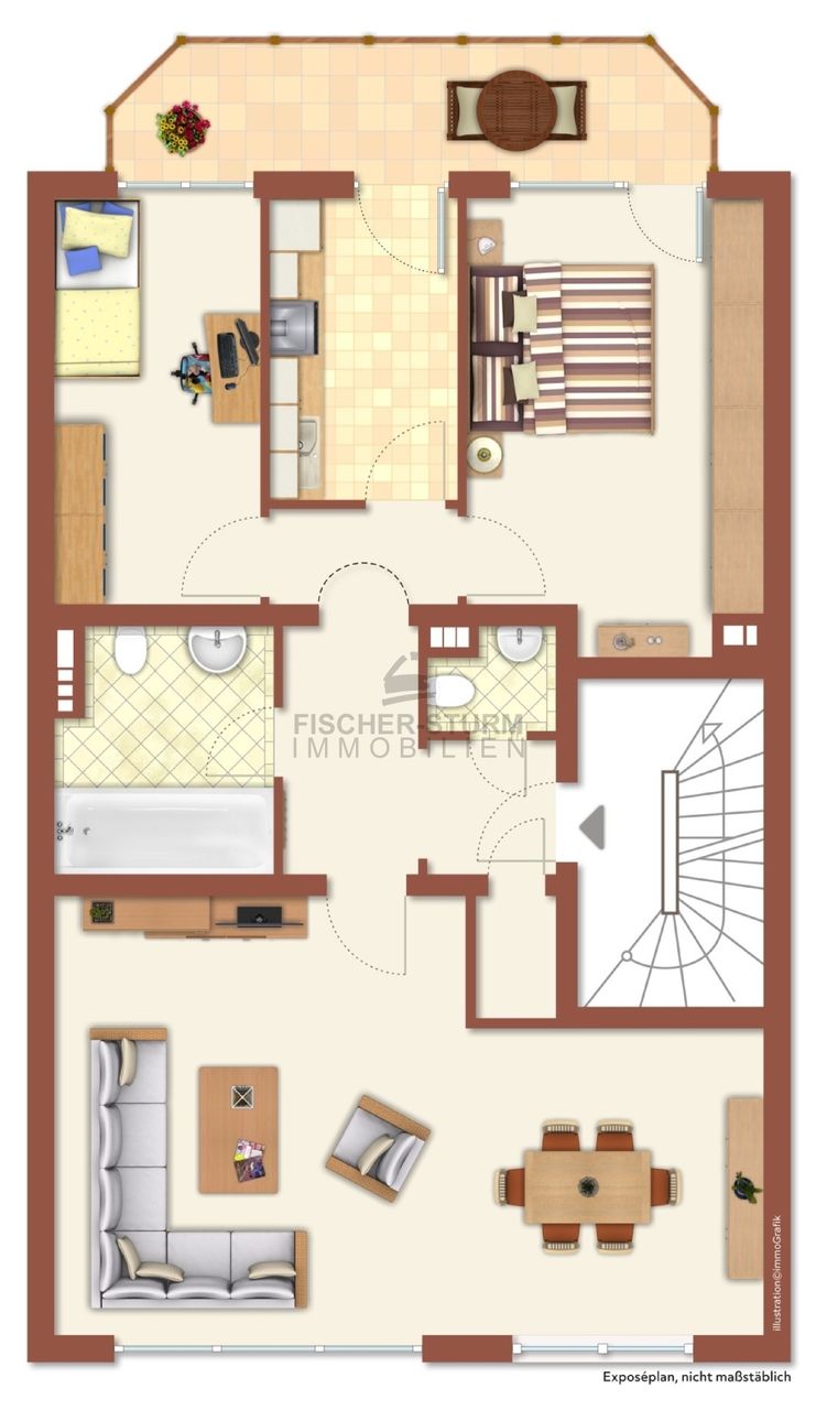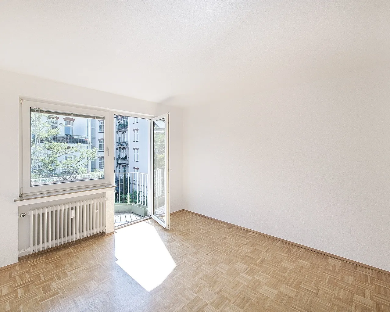 Alle Räume gehen von der Eingangsdiele ab. Das großzügige, helle Wohn-Esszimmer ist zur Straße, die beiden Schlafzimmer sowie die Küche sind zur Rückseite gelegen. Sowohl das größere Schlafzimmer, als auch die (Arbeits-)Küche verfügen über Zugänge zum ostwärts gelegenen Balkon, der reichlich Platz für Tisch und Stühle bietet.