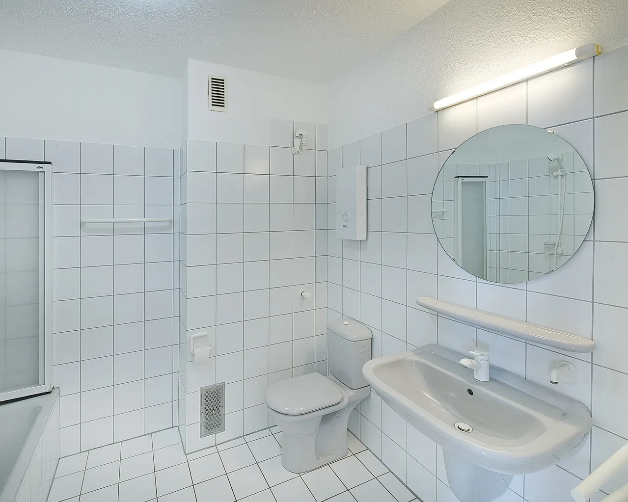 – Bad und Gäste-WC sind weiß gefliest und verfügen über graue, bzw. weiße Sanitärkeramik