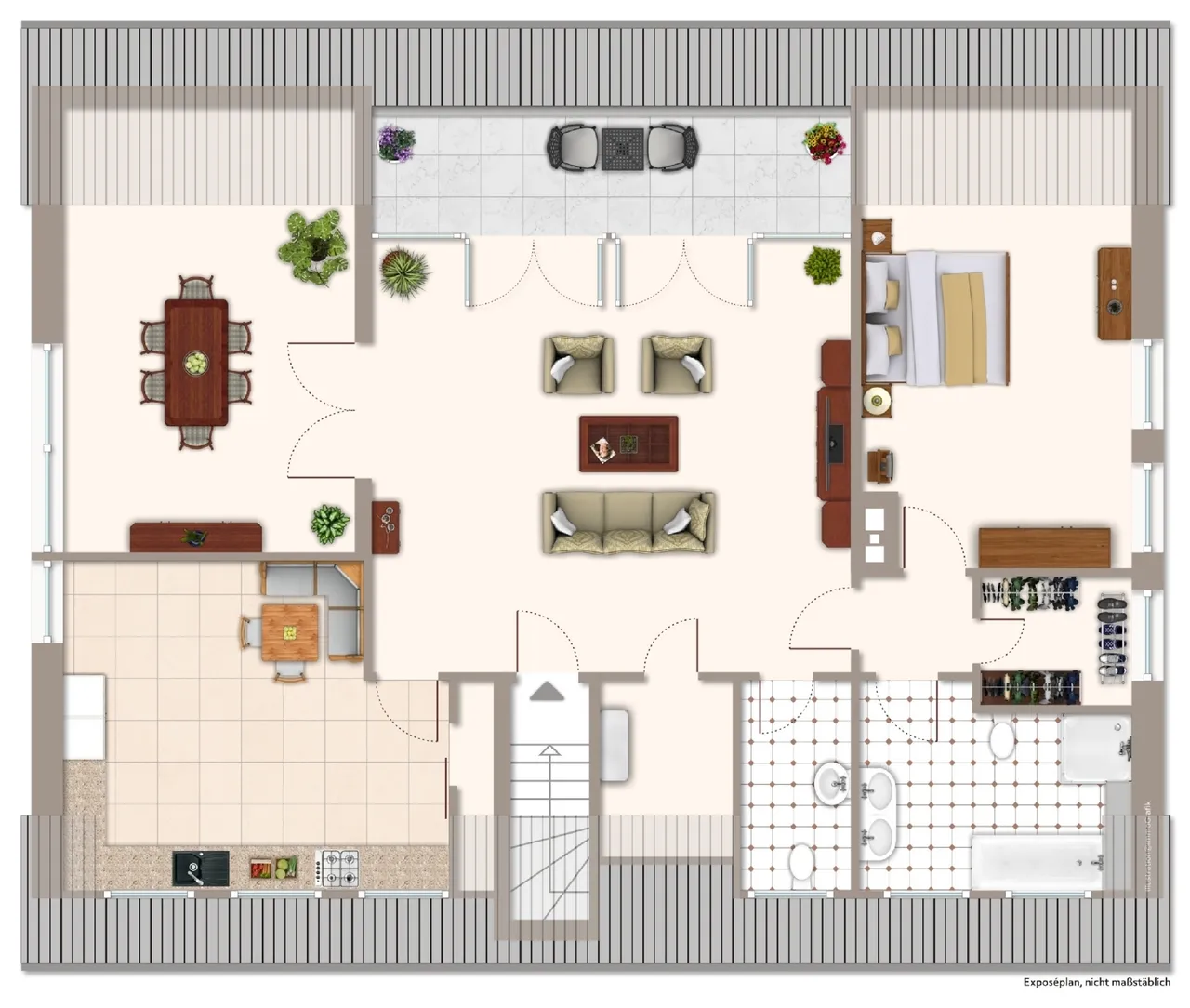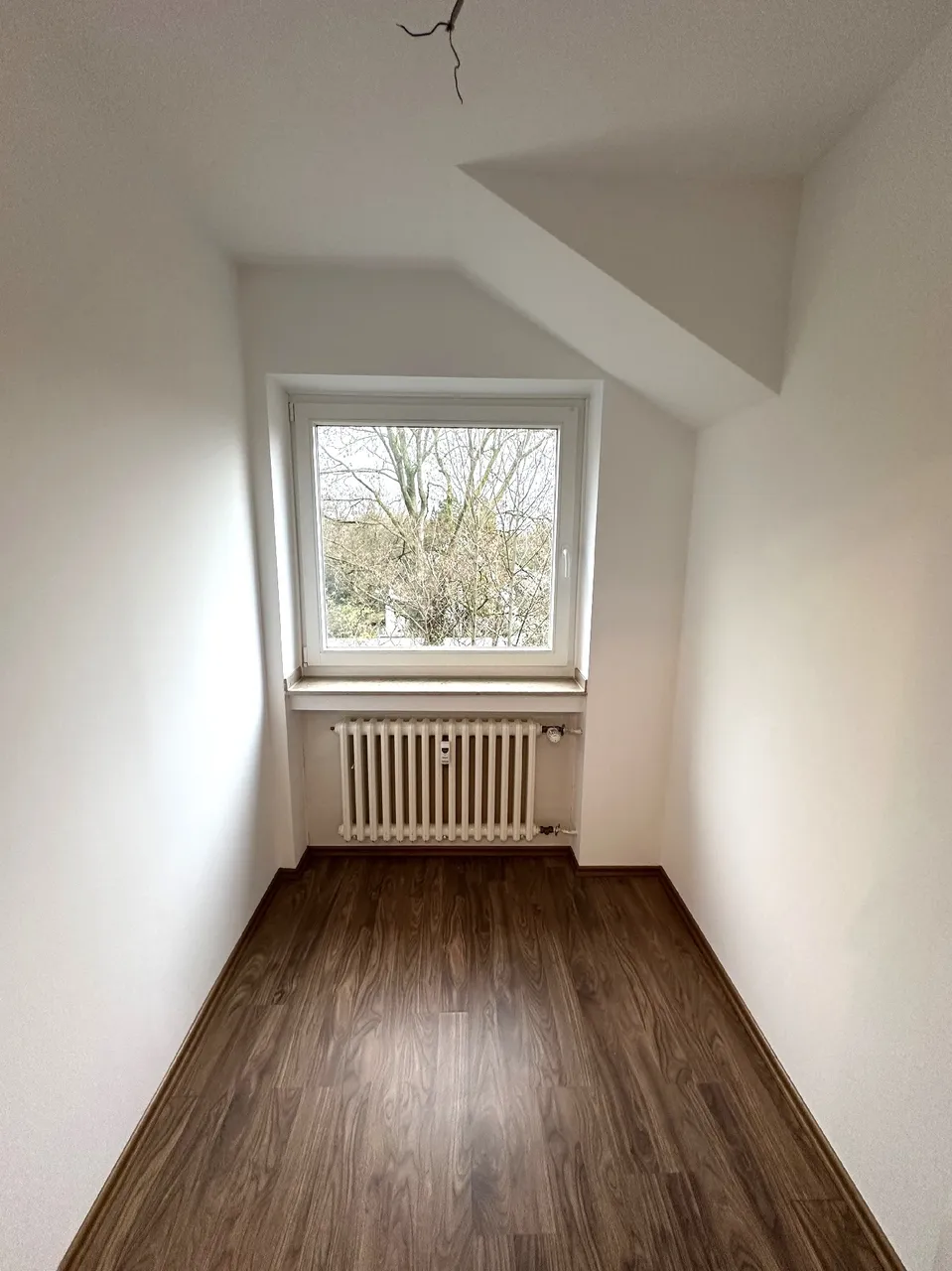 Die Dachgeschosswohnung wurde vor einigen Jahren komplett neu erstellt. Es entstand auf ca. 130 m² Wohnfläche eine 2,5-Zimmer-Wohnung mit einem Schlafzimmer, einem großen Wohnzimmer mit süd-westlich ausgerichtetem Balkon sowie einem Esszimmer. Die Küche ist vom Wohnzimmer aus begehbar, ebenfalls großzügig dimensioniert und mit einer modernen, weißen Einbauküche ausgestattet. Das Bad wurde weiß gefliest, verfügt über Wanne und Dusche und – wie auch das Gäste-WC – über ein Fenster.
