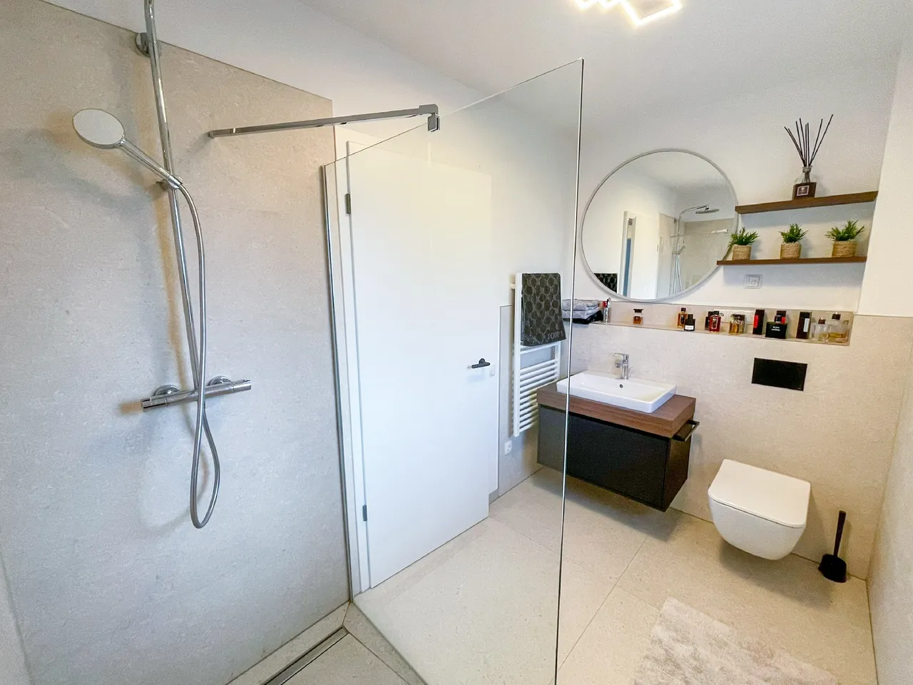 Das stilvolle Tageslichtbad ist mit einer modernen Dusche ausgestattet. Zusätzlich steht ein separates Gäste-WC zur Verfügung. Praktischen Stauraum bietet ein Hauswirtschaftsraum in der Wohnung sowie ein separater Kellerraum. Des Weiteren bietet das Haus einen großen Fahrradkeller für alle Bewohner.