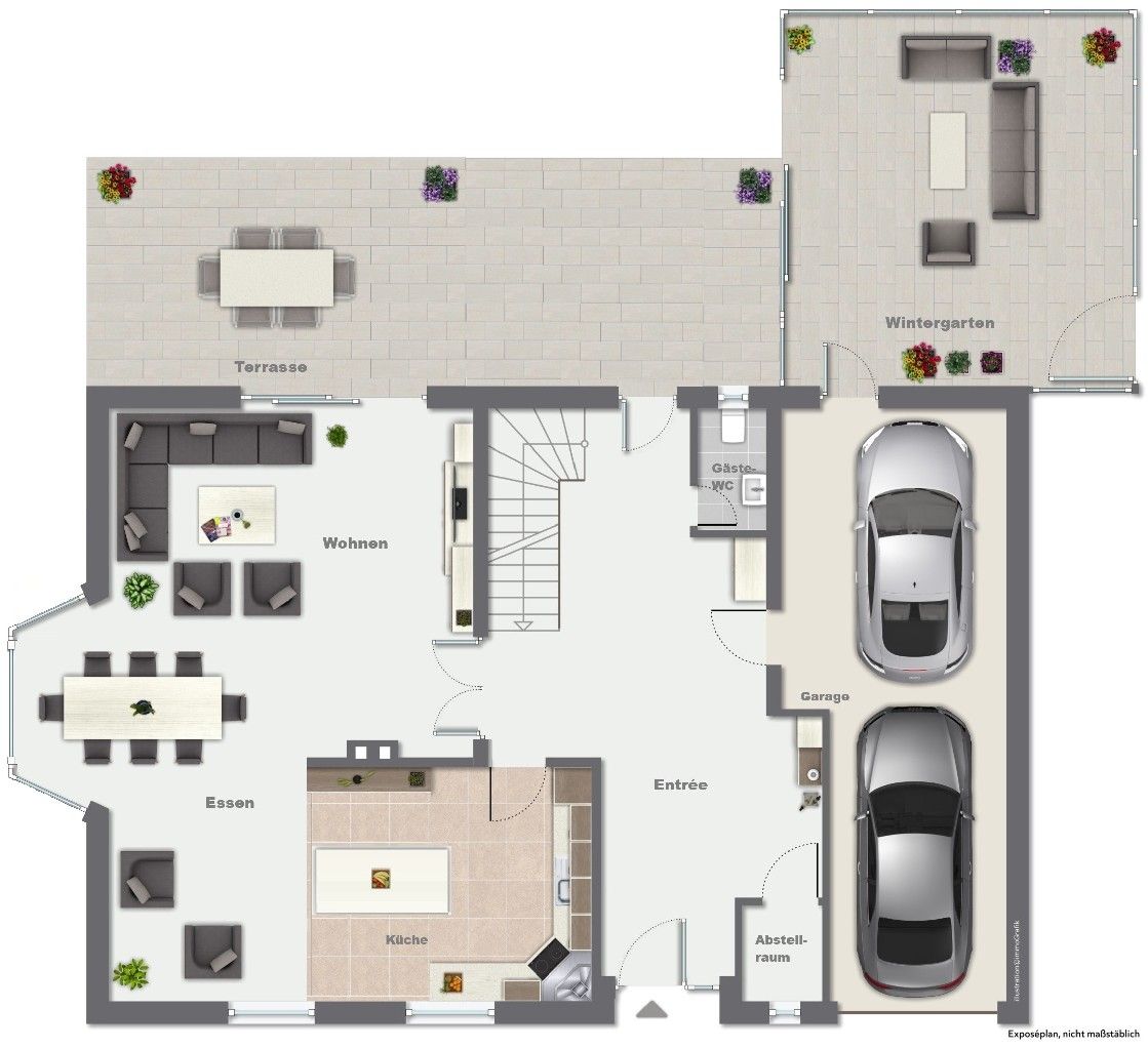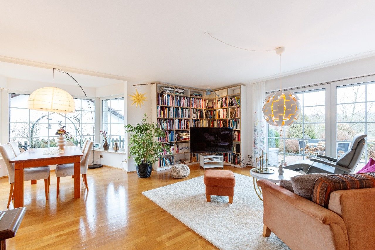 Der offen gestaltete Wohnbereich bietet direkten Zugang zum Wintergarten sowie zur großzügigen Terrasse und schafft eine harmonische Verbindung zwischen Innen- und Außenraum.