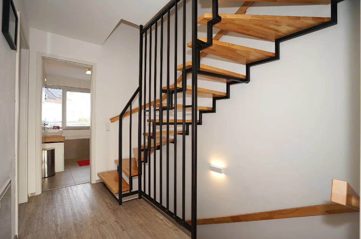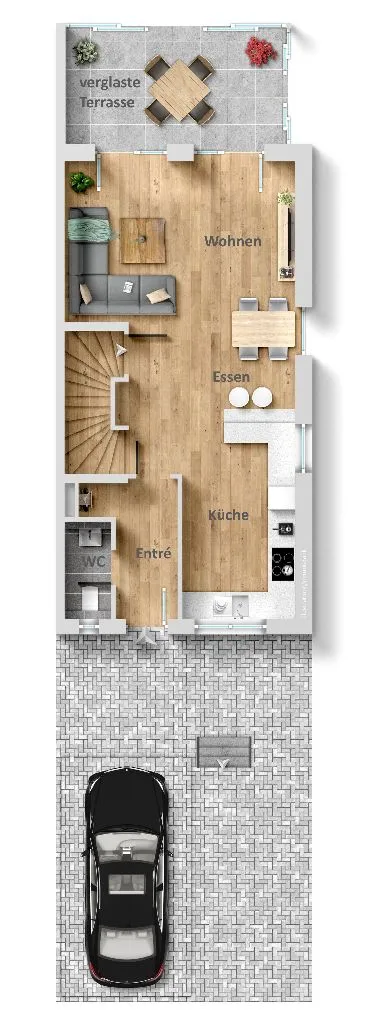 Im Eingangsbereich des Hauses erwartet Sie die die Eingangsdiele mit Garderobe und Zugang zum Gäste-WC. Eine Türe trennt das Entré vom angrenzenden Wohnbereich mit offener Küche und dem internen Treppenauf- und Abgang zu den übrigen Geschossen. Durch die offene Anbindung der modernen Einbauküche ins Wohn- und Esszimmer bleibt die optische Großzügigkeit erhalten.