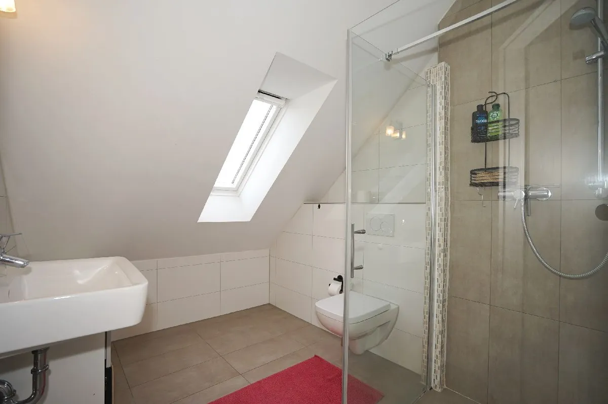 Das Dachgeschoss bietet Raum für zwei weitere abgeschlossene Zimmer sowie das vom gemeinsamen Flur erreichbare Duschbad mit Dachflächenfenster. Die vorhandene Firsthöhe wurde in einem der Zimmer durch den Einbau einer Schlafempore zusätzlich ausgenutzt. Insgesamt stehen hier so ca. 35 m² Wohnfläche z. B. für die Kinder zur Verfügung, die mit dem eigenen Duschbad noch aufgewertet werden. Insgesamt fünf Dachflächen- und zwei Giebelfenster sorgen für optimale Beleuchtungs- und Belüftungsverhältnisse.