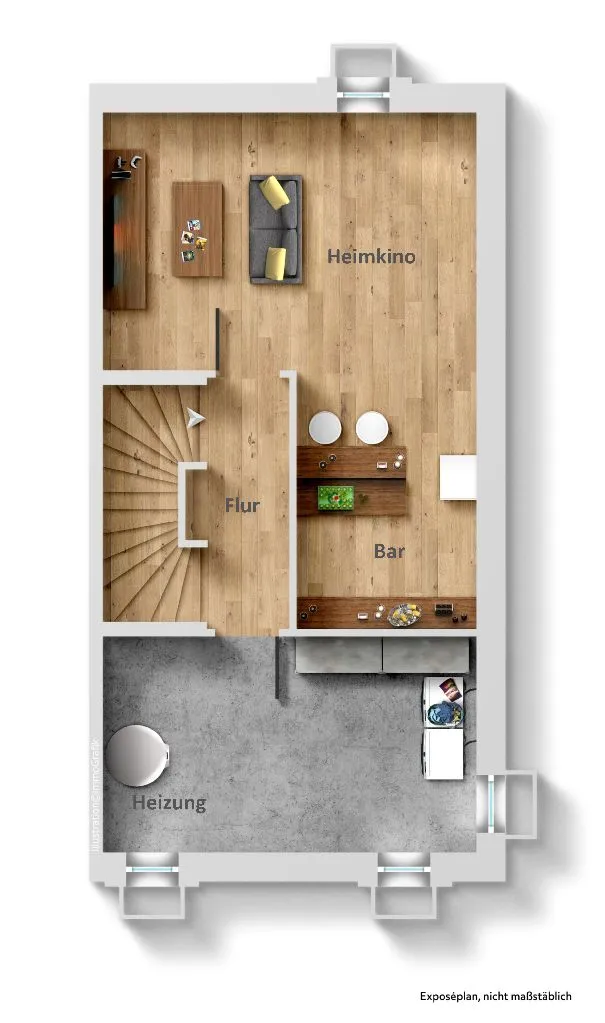 Der Zugang zum Keller befindet sich im Wohnbereich. Hier stehen Ihnen mit einem als Heimkino mit Bar ausgebauten Raum sowie dem Bereich der Haustechnik mit Heizung, Waschküche und Vorrat ca. 45 m² Nutzfläche zur Verfügung.