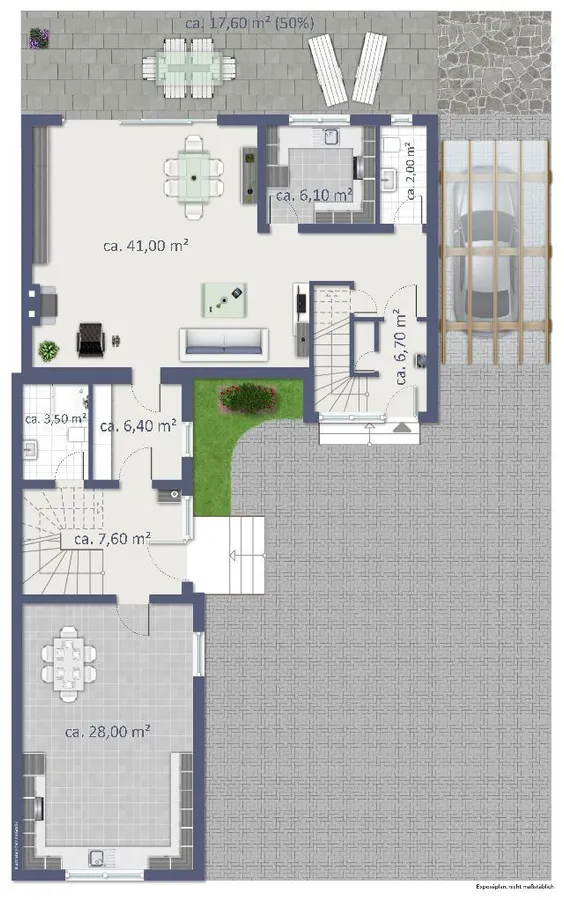 Springbrunnen, Gartenhaus, Gerätehaus, Platz für kleines Gewächshaus, gemauerter und überdachter Bereich für z.B. eine Außenküche und Durchgang zum Carport,Sichtschutzzäune, 2-fach Garage mit zwei elektrischen Toren, Innenhof gepflastert, Vorgarten und Garten neu angelegt, Toranlage, Briefkästen, Stellplätze (vielfach vorhanden).