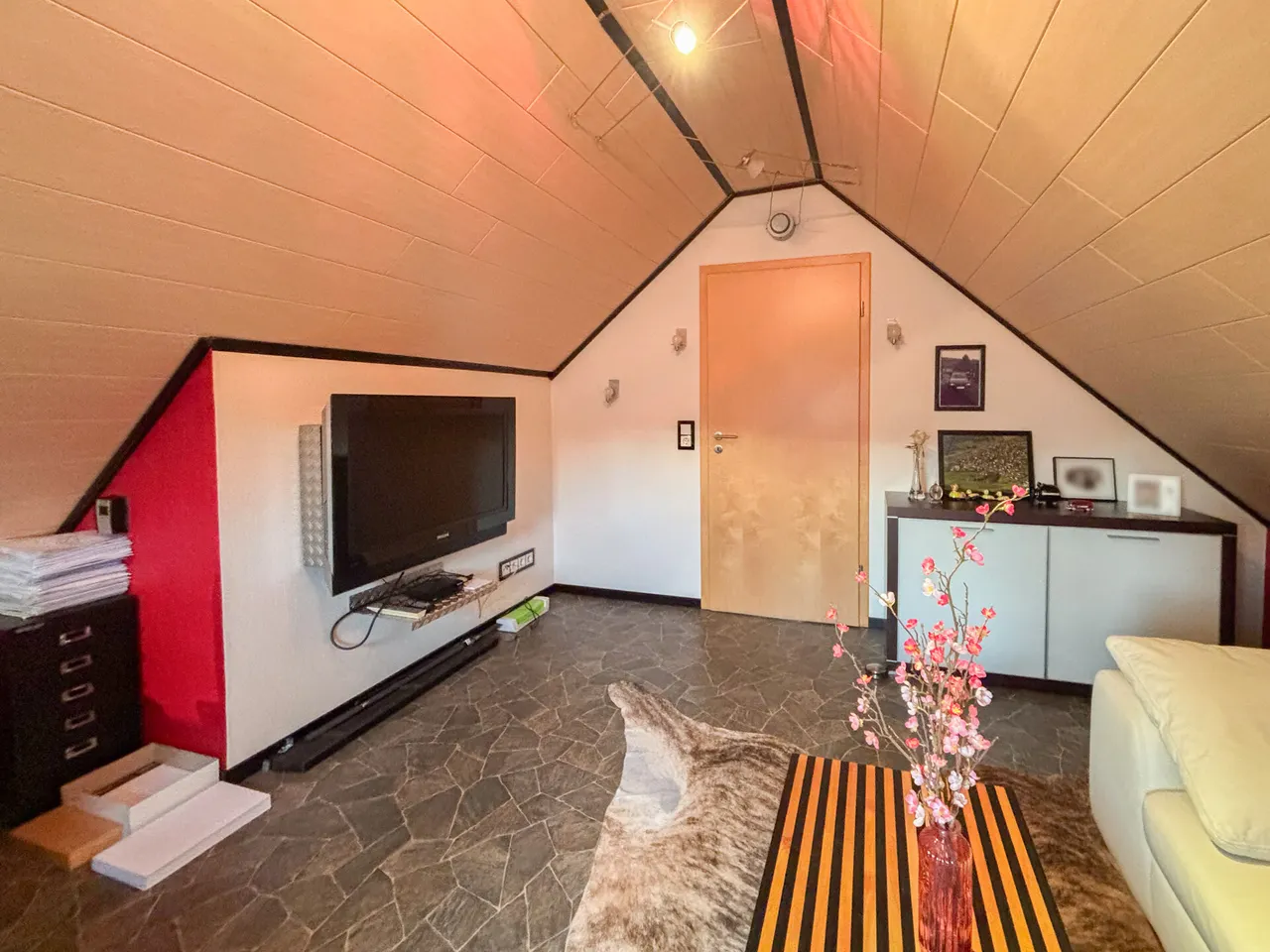 Im Obergeschoss befinden sich weitere Wohnräume, eine Küche, ein Badezimmer sowie eine Waschküche, die bei Bedarf auch problemlos als zusätzliches Schlafzimmer genutzt werden kann. Das Dachgeschoss bietet zusätzlich zwei nützliche Räume. Besonders hervorzuheben sind hier der maßgefertigte Einbauschrank mit Sicherheitsverriegelung sowie die individuell angefertigte Treppe ins Dachgeschoss. Granitdetails an Treppe und Fensterbänken betonen die Exklusivität. Zwei kugelsichere Türen bieten maximale Sicherheit. Dazu gehören Bruchsteinkeller, Garage, vier Stellplätze und eine moderne Photovoltaikanlage.