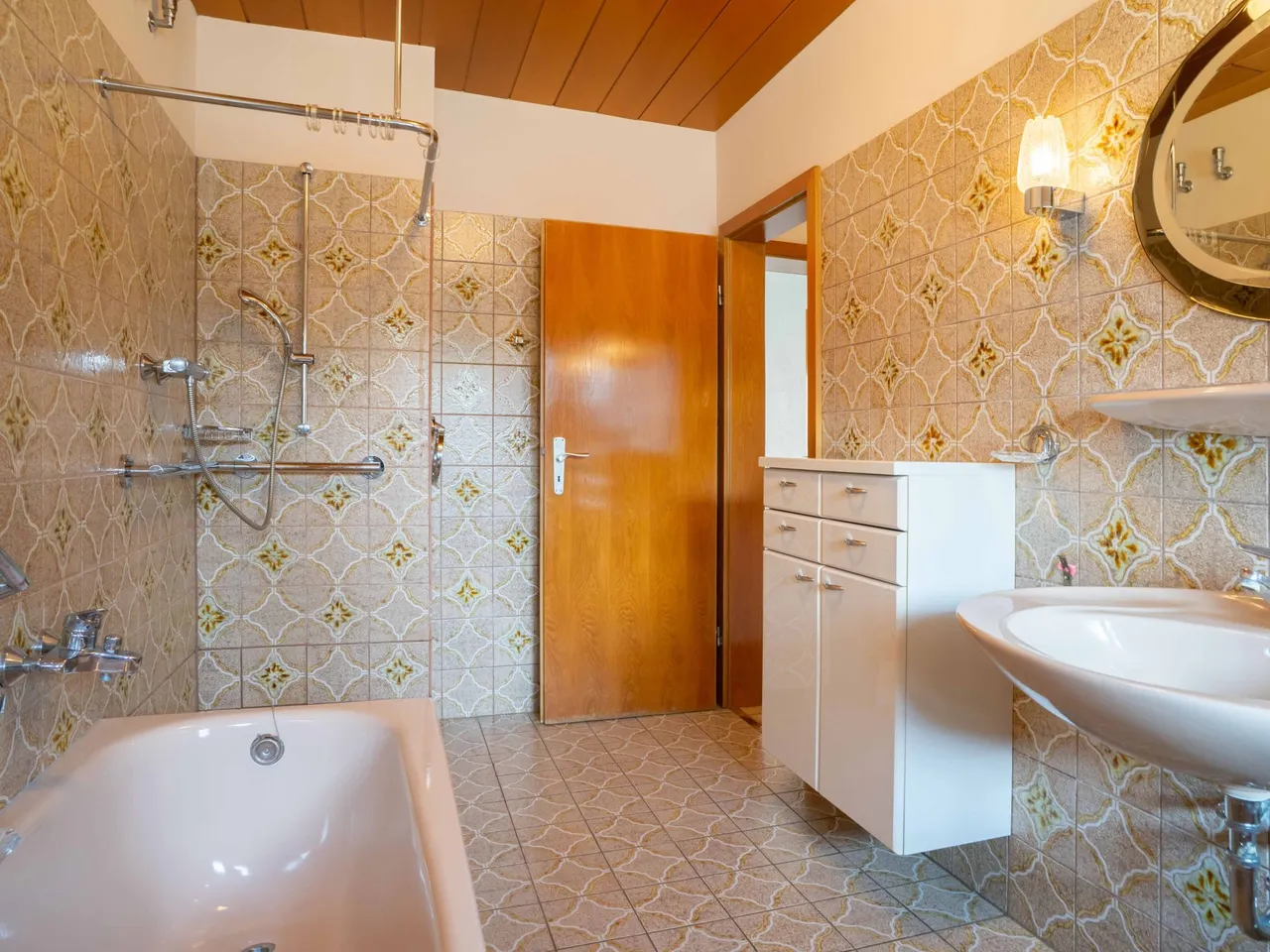 Das Haus verfügt im Erdgeschoss über eine Fußbodenheizung (ideal für eine Wärmepumpe!) und bietet auf rd. 93 m² Wohnfläche: 3 schöne Zimmer, eine kleine Küche, einen Dielenbereich, ein Bad mit bodengleicher Dusche, Wanne und Fenster, ein Gäste-WC mit Fenster und einen Balkon. Die wohnlich ausgebaute Nutzfläche von rd. 66 m² im Kellergeschoss bietet Platz für ein Büro, einen Gästebereich oder auch für eine Pflegekraft: Hier befinden sich ein großzügiger Flur, zwei große, tagesbelichtete Räume und ein Duschbad mit WC. Es besteht sogar die Möglichkeit eine Einliegerwohnung zu schaffen. Aufgrund der Hanglage gelangen Sie aus dem Keller auf die Terrasse und in den Garten. Weiter befinden sich im Keller ein Hausanschluss-, Vorrats-, Heizungsraum sowie ein Wasch-/ und Trockenkeller. Insgesamt stehen rund 190 m² Wohn-/ Nutzfläche zur Verfügung.