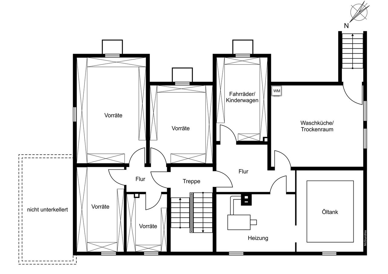 Ein weiterer Pluspunkt ist die Vollunterkellerung: Das Kellergeschoss umfasst sechs separate Kellerräume, einen Waschraum mit Ausgang zur Außenanlage, einen Trockenraum, Flur, Heizraum sowie Tankraum. Für die Bewohner bzw. Mieter stehen zudem fünf Garagen zur Verfügung.