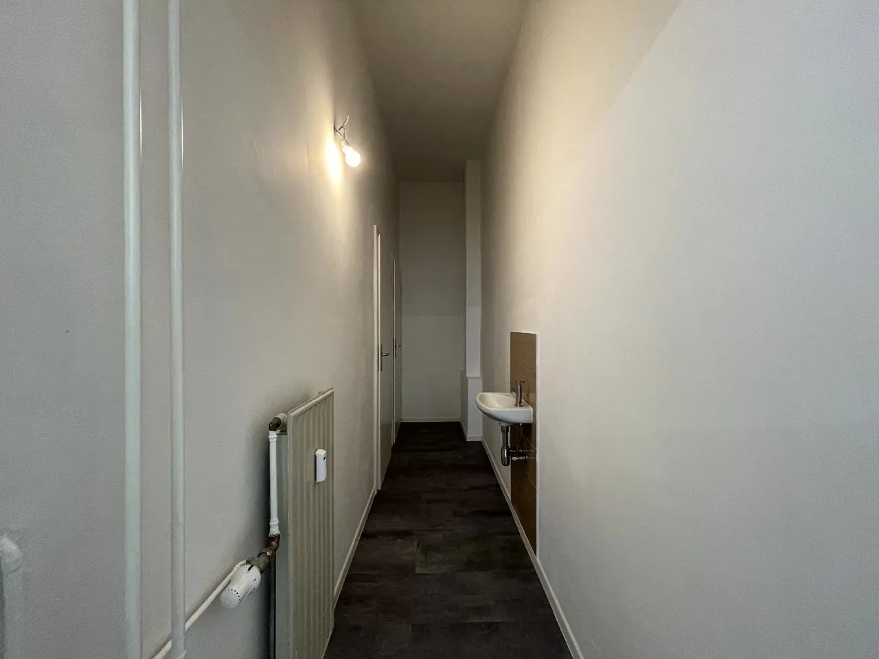 Die Fläche beeindruckt durch ihren offenen Grundriss und das großzügige Raumgefühl, das durch zahlreiche Fenster und die hohen Decken betont wird. Die natürlichen Lichtverhältnisse schaffen eine helle und freundliche Arbeitsatmosphäre, die sich ideal für produktive Arbeitsabläufe eignet. Der frisch verlegte Boden in Holzoptik verleiht dem Raum eine warme, einladende Note und passt perfekt zu den weißen Wänden und der modernen Beleuchtung. Zusätzlich bieten moderne WC-Anlagen sowie eine kleine Teeküche den Mitarbeitern den notwendigen Komfort im Arbeitsalltag.