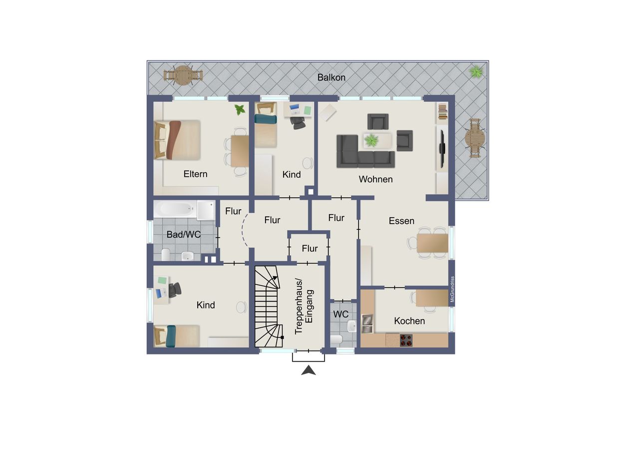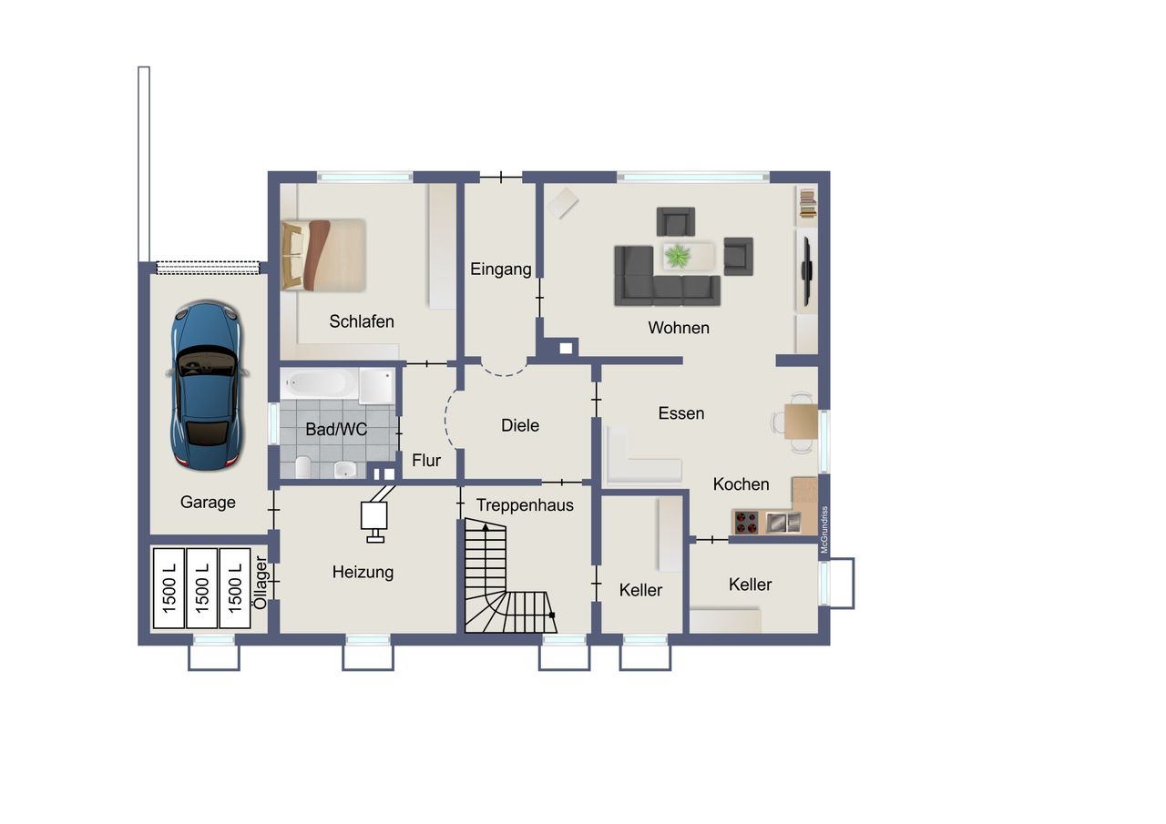 Souterrain ca. 80 m² Wohnfläche: 2 Zimmer, Kochen-/Essen, Diele, Bad/WC und Terrasse. Erdgeschoss ca. 100 m² Wohnfläche: 5 Zimmer, Küche, Diele, Bad/WC, Gäste-WC und Balkon. Dachgeschoss je ca. 45 m² Wohnfläche: 2 Wohnungen mit je 2 Zimmer, Küche, Diele, Bad/WC und Balkon. Garage.