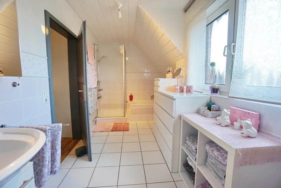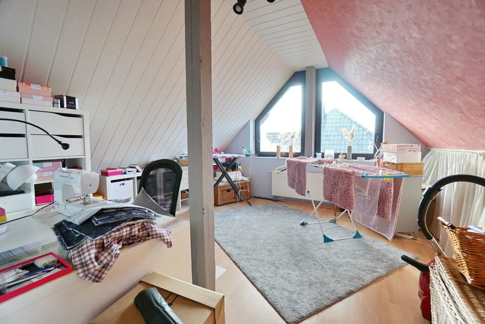 Im Dachgeschoss des Hauses befinden sich drei Schlafzimmer, die ausreichend Platz für Büro und Familie bieten. Das geflieste Tageslichtbad ist mit einer Badewanne und Dusche ausgestattet, was Komfort und Funktionalität vereint. Der Spitzboden ist wohnlich ausgebaut und bietet Platz als Kinder-/oder Hobbyzimmer. Ohne den ausgebauten Spitzboden verfügt die Immobilie über ca. 120 m² Wohnfläche.