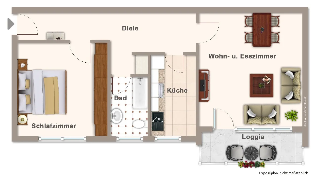 Der Wohnbereich mit ca. 21 m² wirkt hell und bietet ausreichend Stellfläche. Angrenzend lädt die Loggia an sonnigen Tagen zum Sonnenbaden und Entspannen ein. Der langgezogene Flur verbindet alle Räume miteinander und sorgt für eine harmonische Raumführung. Das Wannenbad verfügt über ein Tageslichtfenster und präsentiert sich in einem gepflegten Zustand. Sowohl die Küche als auch das Schlafzimmer bieten angenehme Größen und praktische Nutzungsmöglichkeiten.