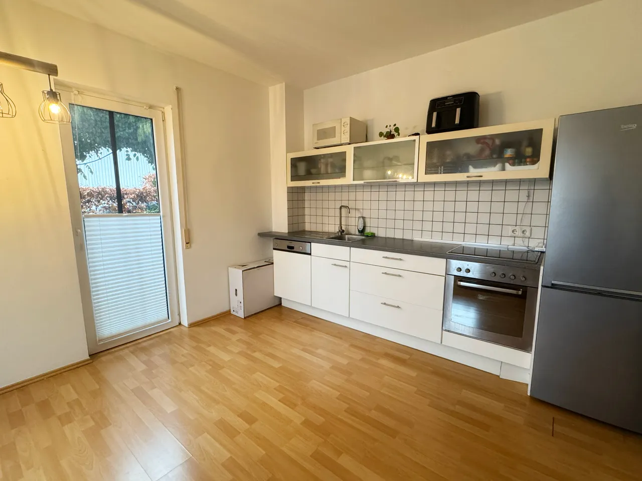 Sonnige 2-Zimmer-Einliegerwohnung mit eigener Terrasse. Ess-/ und Wohnzimmer mit offenem Küchenbereich, Schlafzimmer, Bad mit Dusche, Fenster und Waschmaschinenanschluss, Diele mit Abstellraum. Böden: Wohnräume Laminat, Diele und Bad helle Fliesen. Alle Fenster sind mit Rollläden ausgestattet. Die Wohnung ist ideal für Singles.