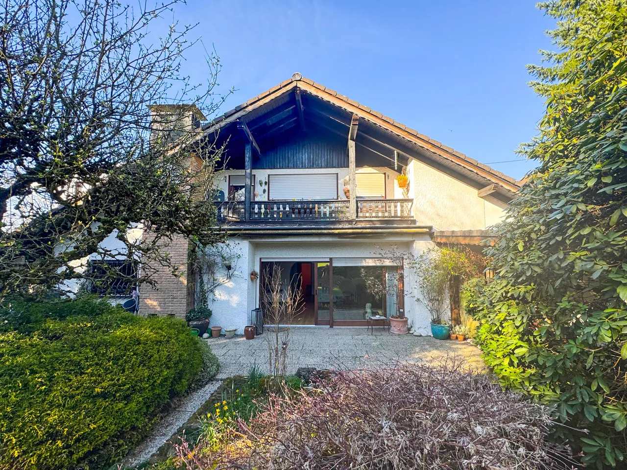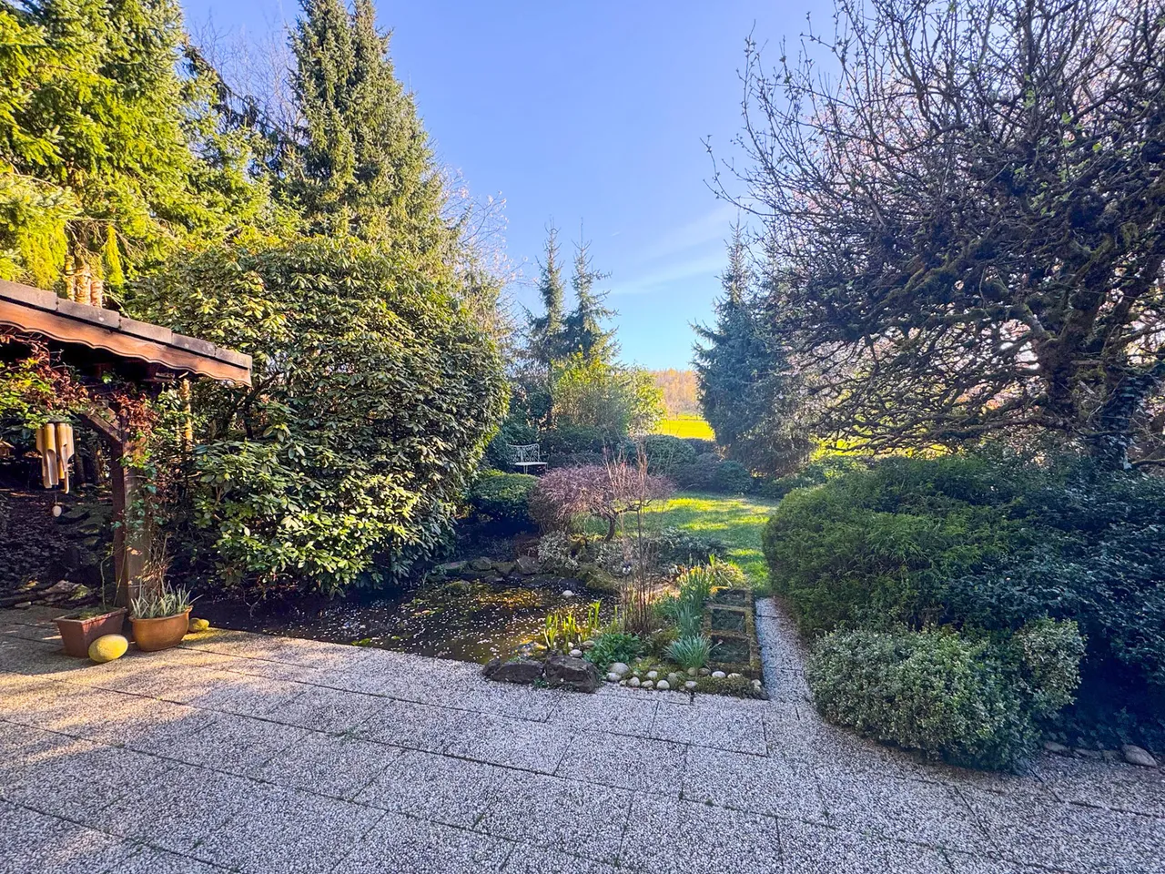 In naturnaher und ruhiger Lage befindet sich diese Eigentumswohnung im Erdgeschoss eines Zweifamilienhauses aus dem Jahr 1982. Die Immobilie überzeugt durch eine großzügige Wohnfläche von rund 112 m² sowie eine durchdachte Raumaufteilung, die ein komfortables Wohnen ermöglichen – ideal für Paare, kleine Familien oder auch als Altersresidenz. Das Herzstück der Wohnung bildet das großzügige Wohnzimmer mit einem offenen Kamin, der besonders in den kühleren Monaten für eine gemütliche Atmosphäre sorgt. Von hier aus gelangt man direkt auf die sonnige Terrasse mit Blick in den liebevoll angelegten Garten. Neben dem Wohnbereich bietet die Wohnung zwei weitere gut geschnittene Zimmer, die sich flexibel als Schlafzimmer, Kinderzimmer oder Homeofficeplatz nutzen lassen. Die Küche, ein Tageslichtbad sowie ein separates Gäste-WC ergänzen den praktischen Grundriss.