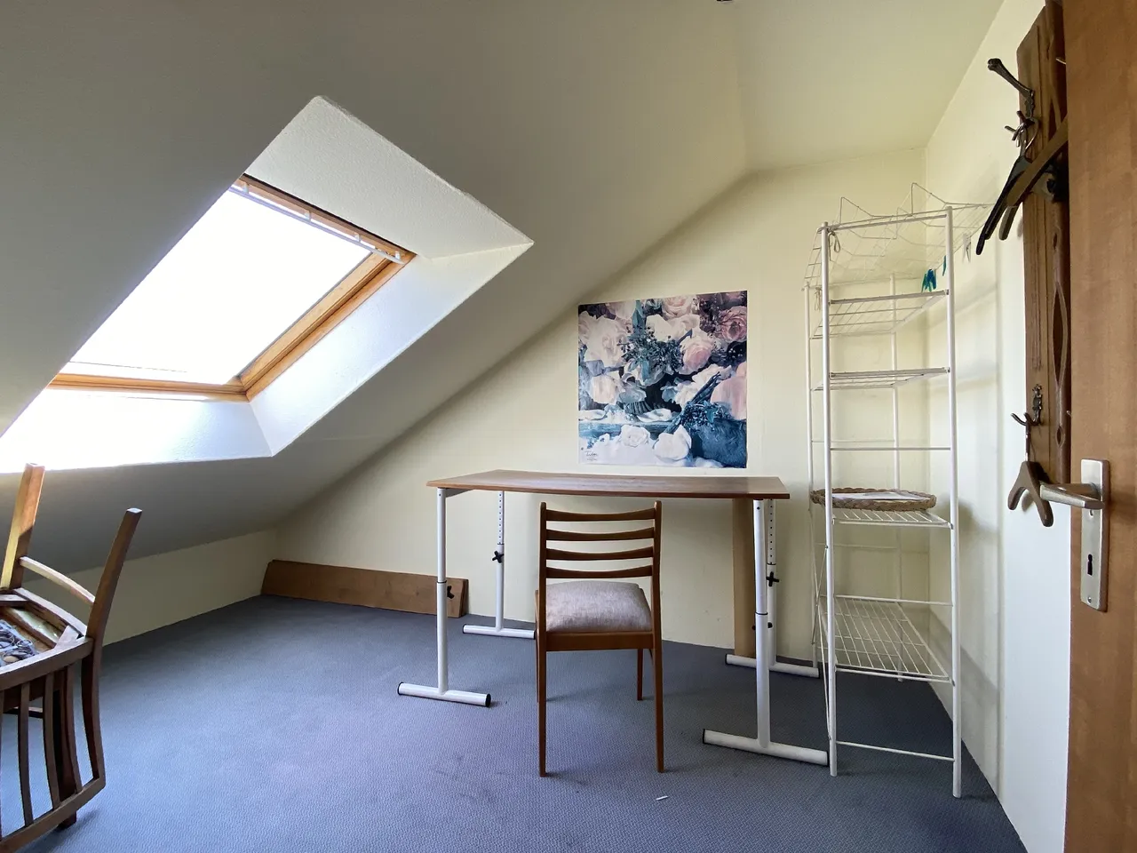 Der Treppe weiter ins Dachgeschoss gefolgt, erwarten Sie hier ein großzügiger Raum, welcher in früheren Jahren als Kinderzimmer, später als Gästezimmer, genutzt wurde sowie ein kleinerer Raum, welcher auch die Heiztherme beherbergt. Letzterer eignet sich hervorragend als kleines Homeoffice. Beide Räume sind nicht mit in die Wohnfläche eingerechnet. Es handelt sich hier um wohnlich ausgebaute Nutzfläche. Ein kleiner Abstellraum im Drempel des Daches bietet Stauraum.