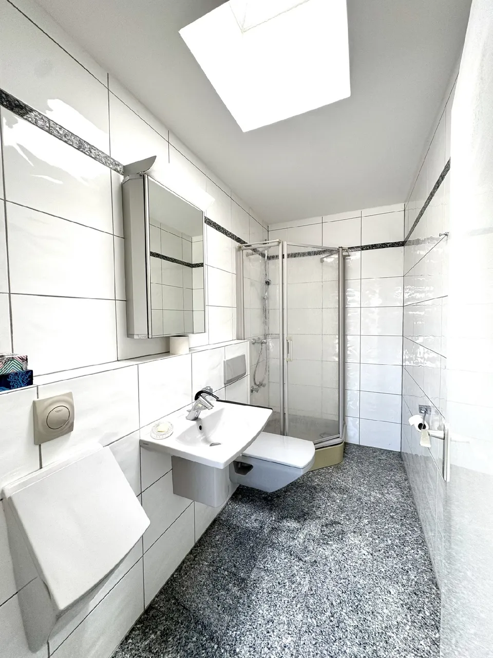– hell gefliestes Tageslichtbad in der Einliegerwohnung, ausgestattet mit Dusche, Waschtisch und WC