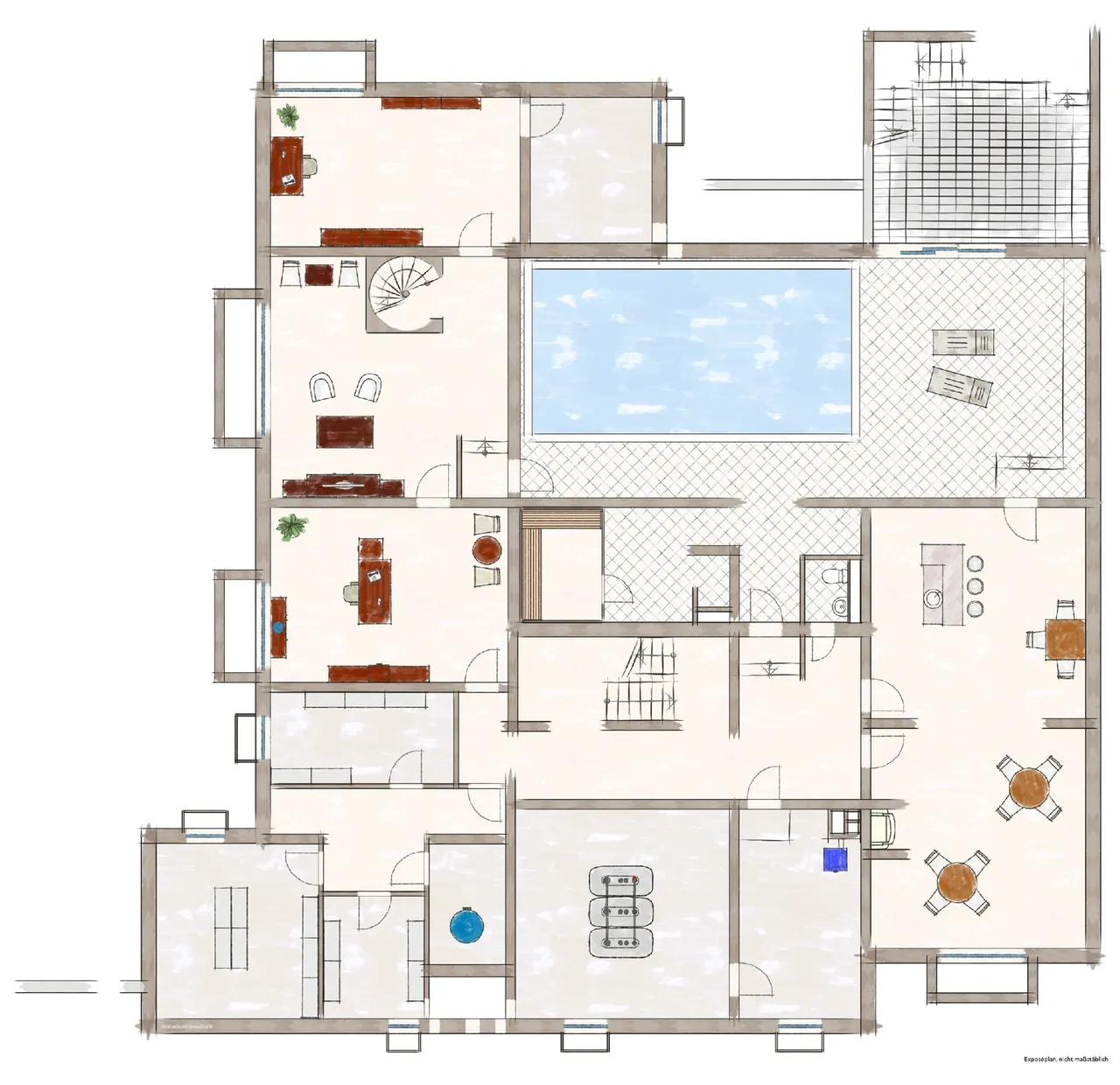 – beheizbarer, gefliester Kellerbereich mit diversen Hobbyräumen, Barbereich mit Kamin, Schwimmbad, Sauna, Dusche und WC
