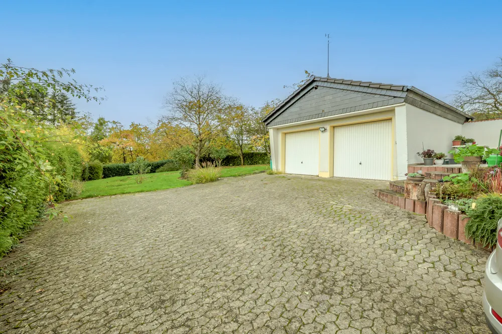 Zum Anwesen gehört außerdem eine Doppelgarage mit Satteldach und zusätzlicher Stellfläche auf dem Grundstück.