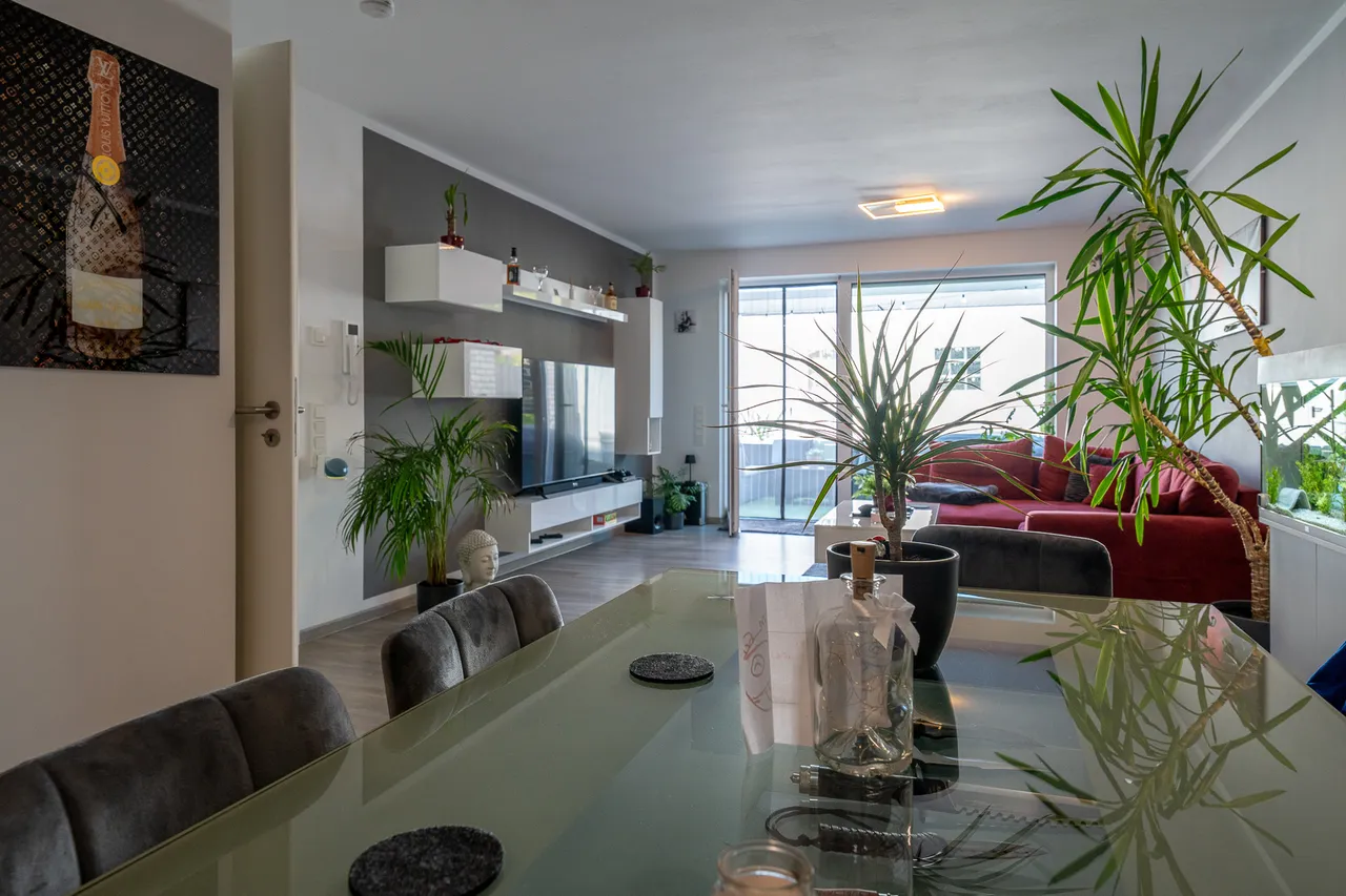 Stellen Sie sich vor, Sie betreten eine frisch erbaute Erdgeschosswohnung aus dem Jahr 2021, die modernes Wohnen mit höchstem Komfort verbindet. Auf rund 68 m² entfaltet sich ein lichtdurchfluteter, offener Wohn-, Ess- und Kochbereich, der mit seinen großen Kunststofffenstern und elektrisch bedienbaren Rollläden nicht nur für Helligkeit sorgt, sondern Ihnen auch jederzeit Privatsphäre garantiert. Von hier aus treten Sie direkt auf Ihre eigene, ruhige Terrasse – ein kleines Paradies zum Entspannen, Frühstücken oder für gesellige Abende mit Freunden, ganz geschützt zum Innenhof ausgerichtet.