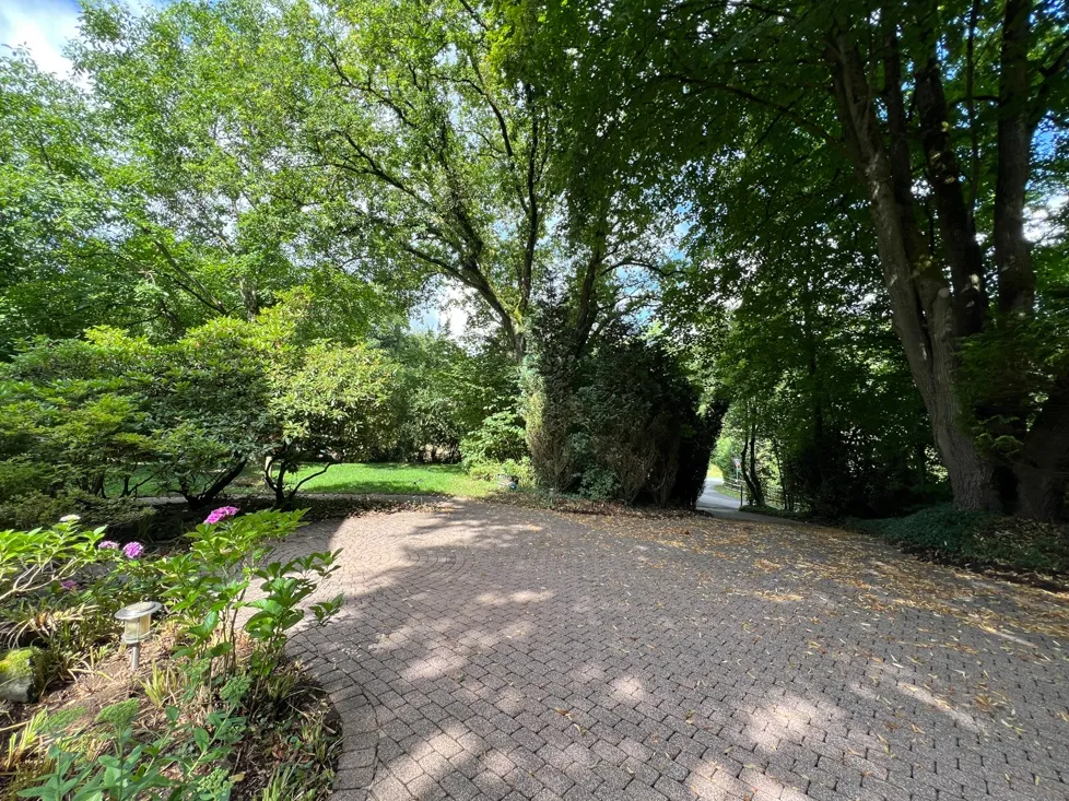 Außenanlagen: Gepflasterte Zufahrt, Wiesen, Bäume, Waldgebiet
