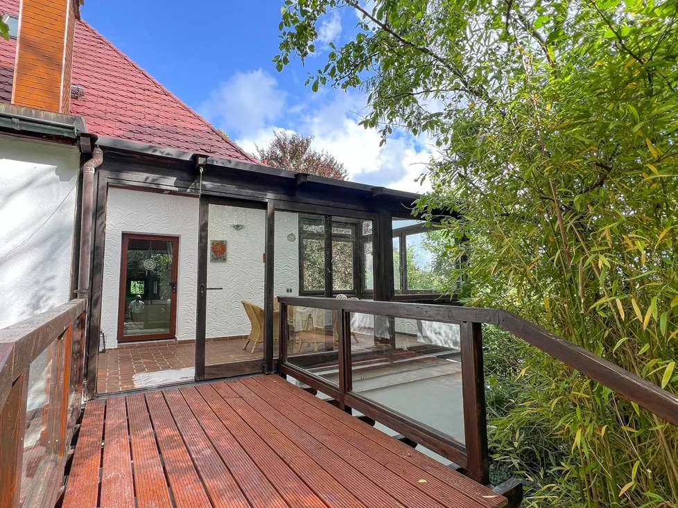 Die zur Gartenseite gelegene Außenwand zum Poolbereich wurde ehemals nach einem Brandschaden nicht wieder hergerichtet. Möglichen Käufern bleibt es selbstverständlich überlassen, diese Fläche wieder durch eine Mauer zu schließen und hier eine schöne Badelandschaft zu gestalten. Hinter dem Pool befindet sich noch ein Durchgang zu einer ca. 27qm großen Terrasse.