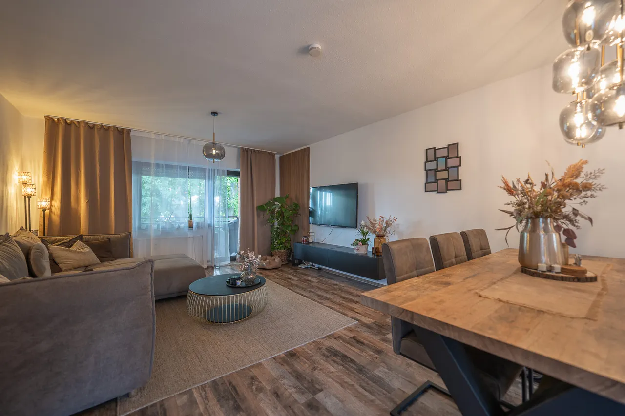 Das Herzstück: der offene Wohn- und Essbereich mit direktem Zugang zum überdachten Süd-/West-Balkon – hier genießen Sie Morgenkaffee im Sonnenlicht oder entspannte Abende mit Blick ins Grüne. Modernes Badezimmer, Gäste-WC und eigener Stellplatz machen den Alltag komfortabel und unkompliziert.