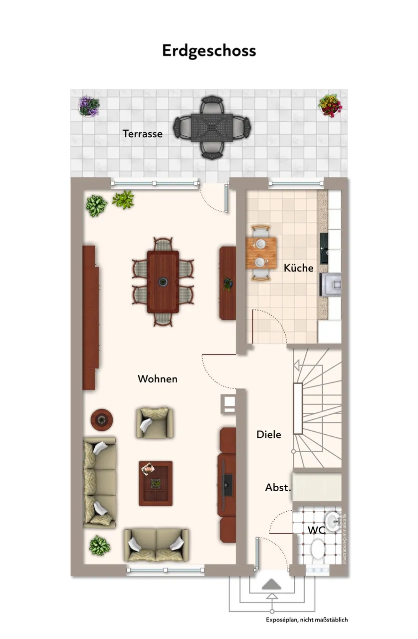 Beim Betreten des Hauses empfängt Sie ein heller Eingangsbereich mit einem praktischen Gäste-WC. Die Küche bietet ausreichend Platz für kulinarische Entfaltung und ist direkt mit dem großzügigen Wohn- und Esszimmer verbunden. Große Fenster sorgen für viel Tageslicht und schaffen eine freundliche Atmosphäre. Von hier aus gelangen Sie direkt auf die Terrasse mit Markise und Windschutz ein idealer Ort für entspannte Stunden im Freien.