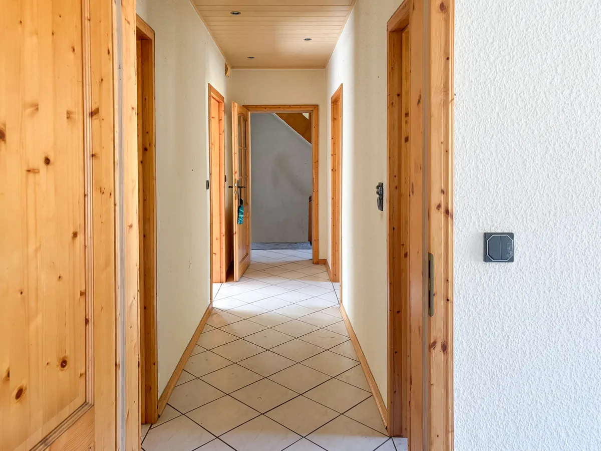 Im Erdgeschoss befindet sich ein Koch- und Essbereich, ein Wohnzimmer mit Zugang zum Wintergarten, ein weiteres Zimmer und ein Bad. Im Obergeschoss finden Sie zwei Schlafzimmer und ein kleineres Zimmer, eine Küche sowie ein Badezimmer. Zusätzlichen Stauraum finden Sie im Keller des Hauses.