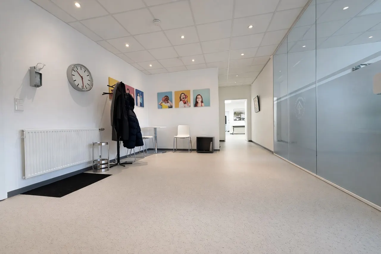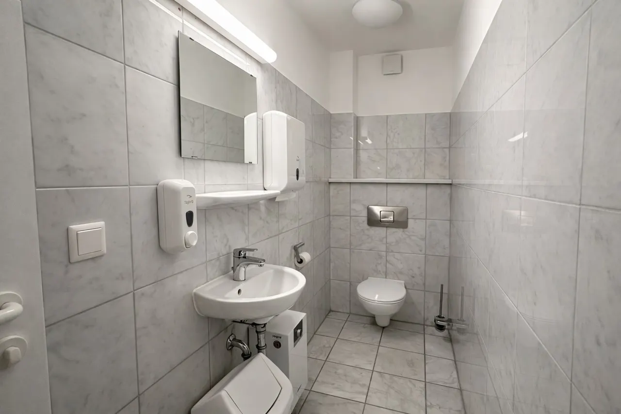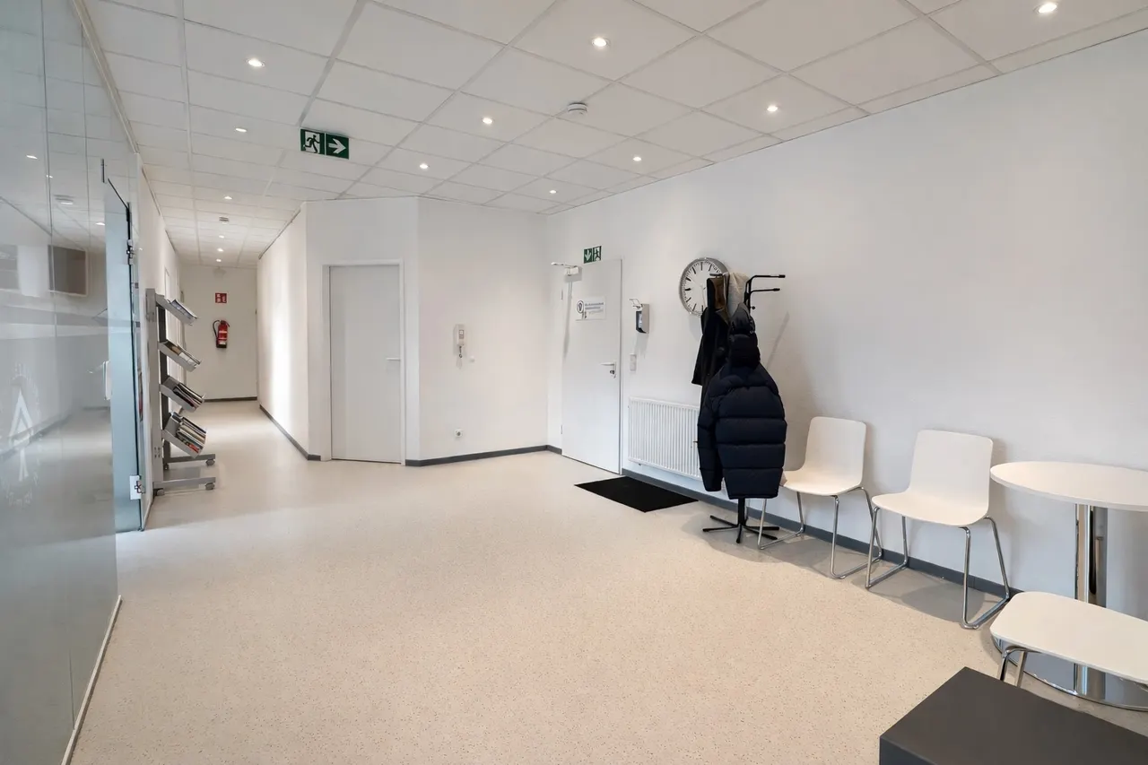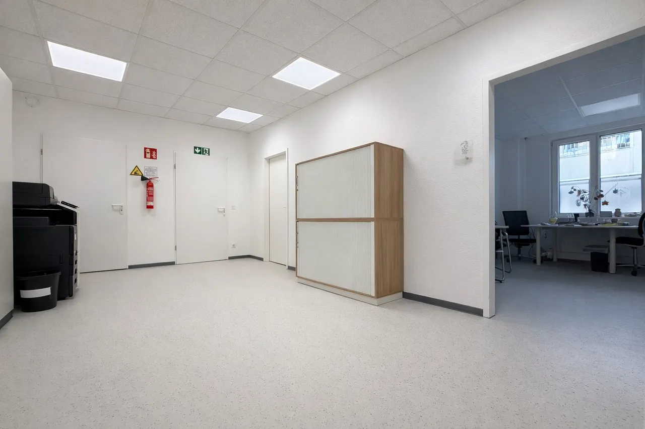 Die Ausstattung der Flächen präsentiert sich in einem gepflegten und zeitgemäßen Zustand. Helle Wandflächen, moderne Bodenbeläge sowie eine abgehängte Rasterdecke mit integrierter Beleuchtung schaffen eine professionelle und angenehme Arbeitsatmosphäre.