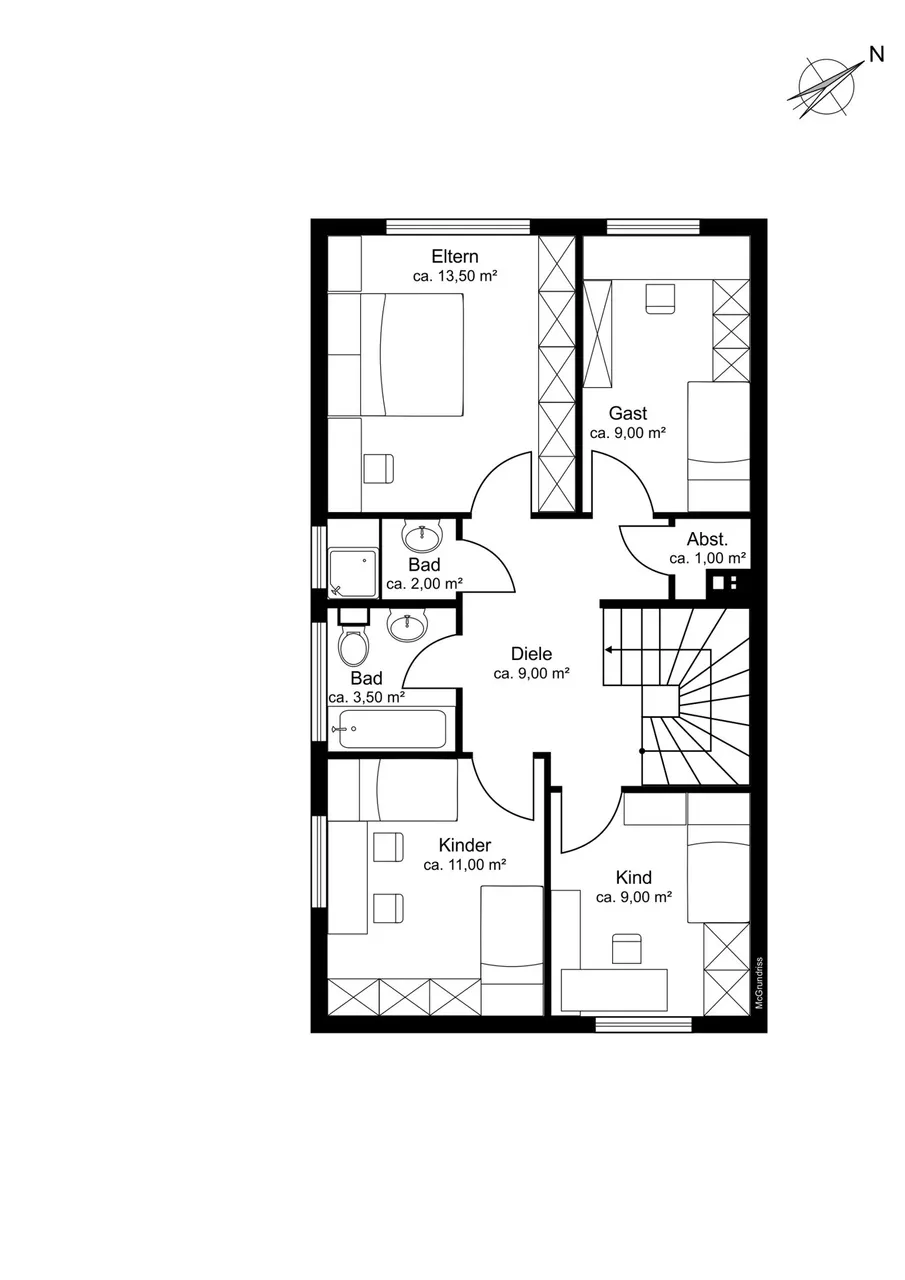 Im ersten Obergeschoss erwarten Sie vier schrägenfreie Schlafzimmer und zwei moderne Tageslichtbäder – ideal für Familien oder die Kombination aus Wohnen und Arbeiten. Der ausgebaute Dachbereich bietet zudem einen perfekten Rückzugsort oder ein geräumiges Elternschlafzimmer. In den Ursprungsplänen war im Dachgeschoß ein weiteres Badezimmer geplant.